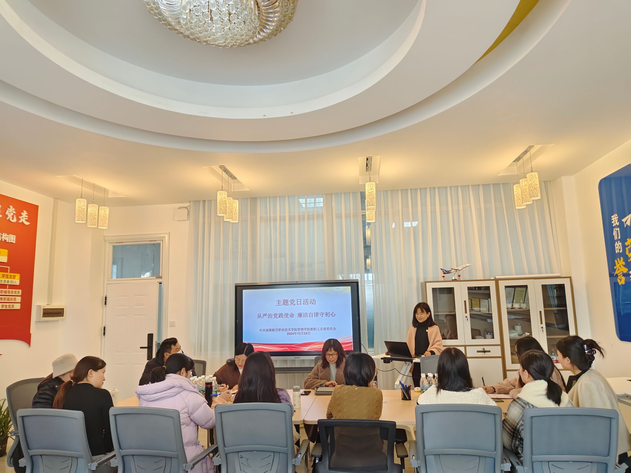 为深入学习贯彻习近平新时代中国特色社会主义思想,进一步加强党风廉政建设,增强党员教师的廉洁意识和责任感,营造风清气正的工作环境,管理学院教师党支部于12月24日在知行楼504开展了“从严治党践使命 廉洁自律守初心”主题党日活动。会议由教师支部书记王娅主持,支部全体党员参加。