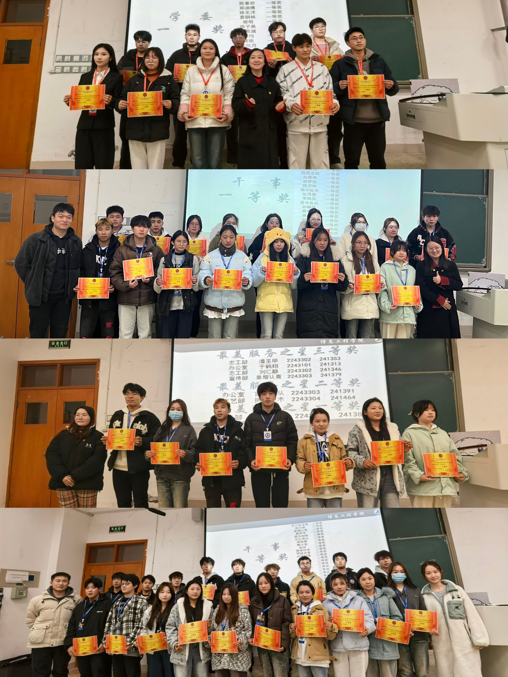 第二项议程,表扬先进。大会为在各自岗位上做出杰出贡献和取得显著成绩的同学们颁发属于他们的荣誉,梁天伟宣读“最美服务之星”“优秀干事”以及“优秀学生委员”等荣誉称号的获奖人名单,参会老师颁发奖状,以资鼓励,他们用智慧和汗水书写了团学会的辉煌篇章,用实际行动诠释了奉献精神。