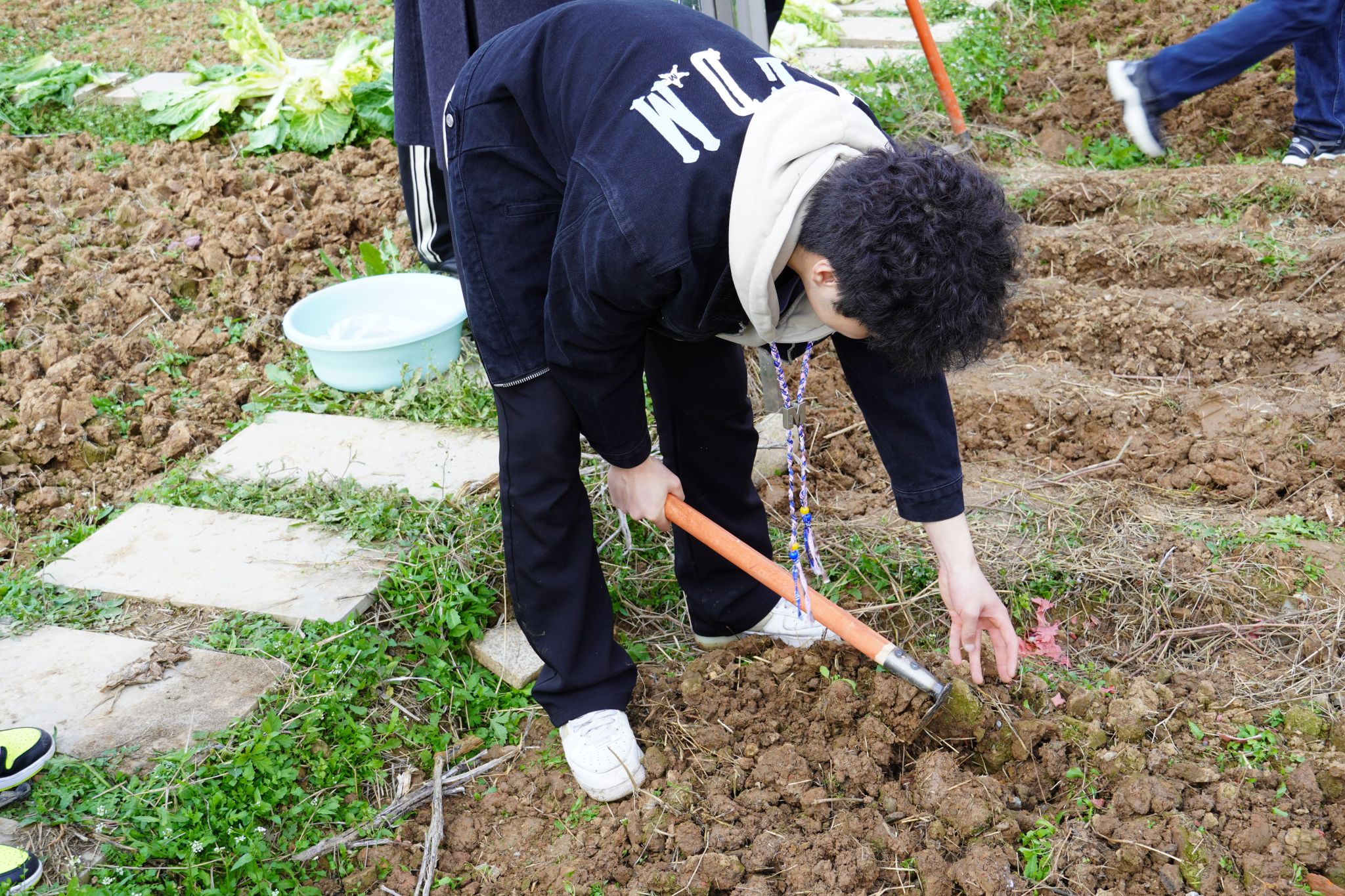 下午两点,春阳煦暖。在老师们的示范指导下,同学们以班级为单位,翻土组挥锄深挖,将板结的土壤细细打散;播种组精准测量,确保每粒种子保持最佳间距;施肥组巧手点施,用有机肥为幼苗筑牢根基。虽然动作略显生疏,但田垄间此起彼伏的讨论声与欢笑声,交织成生动的劳动交响曲。