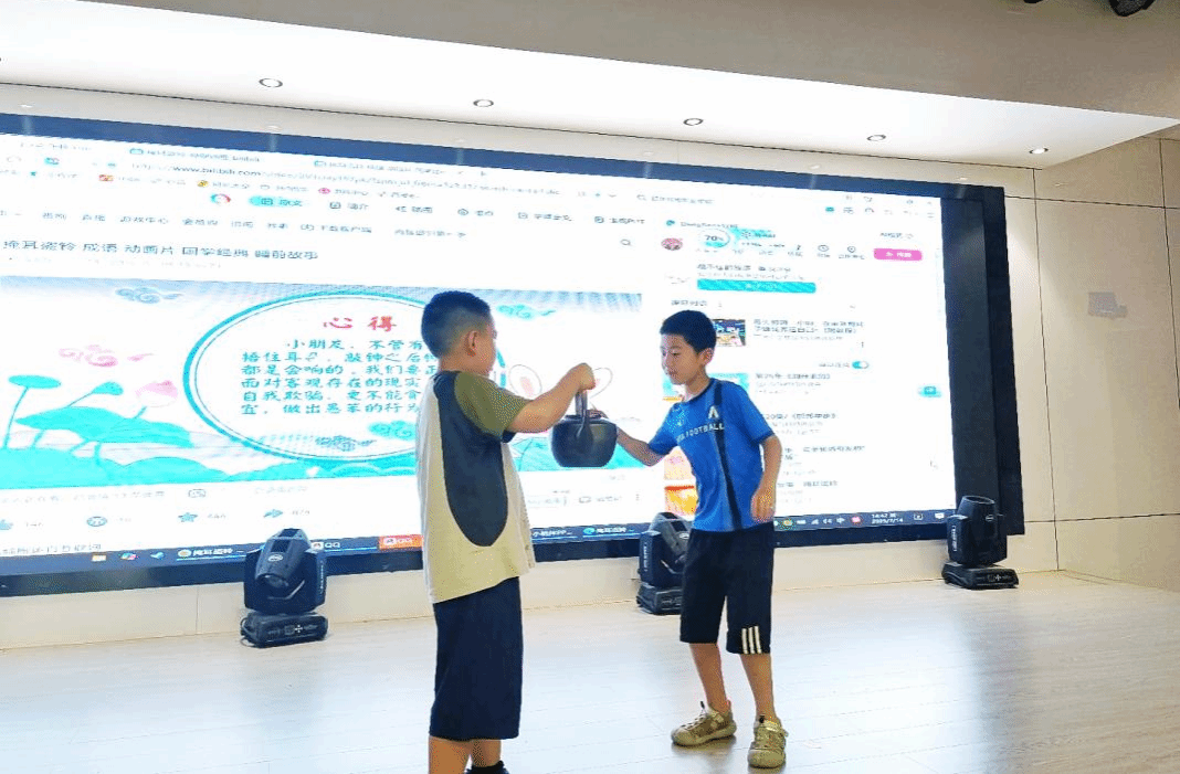 小学组以 “成语学习” 为主线,通过动画短片、情景演绎、趣味竞赛深化学习效果。志愿者精选《掩耳盗铃》《夸父逐日》等经典成语故事视频,助力孩子直观理解寓意。视频结束后,孩子们积极互动:胆大的上台用夸张动作演绎 “掩耳盗铃”,引发全场大笑;有的结合生活实例解读 “夸父逐日”,展现超龄理解能力。最后的成语接龙比赛中,孩子们分组角逐,获胜者获荧光棒奖励,未获奖者也收到鼓励贴纸,现场始终洋溢积极氛围。