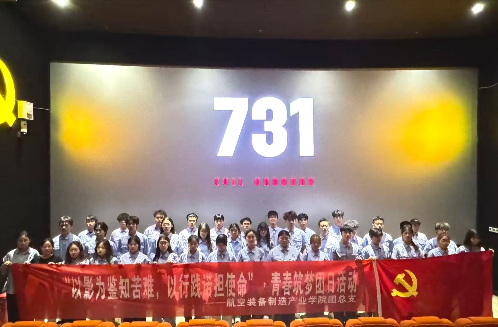 为纪念中国人民抗日战争暨世界反法西斯战争胜利80周年和九一八事变爆发94周年,进一步加强爱国主义教育,9月18日,航空装备制造产业学院学生党支部组织师生党员和共青团干部共50余人走入影院开展以“铭记国殇砺初心 航空报国勇担当”为主题的爱国主义教育观影活动,集体观看历史题材影片《731》,不断强化党员学生和团干尽责履职,共同筑牢理想信念根基。