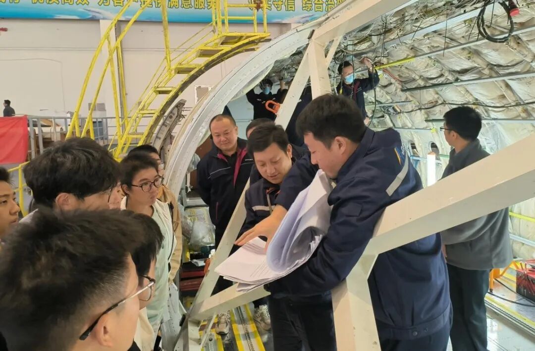活动伊始,师生们走进公司维修现场,由行业负责人担任“讲解员”,围绕飞机维修流程、技术应用等展开细致讲解。其中,针对客改货飞机的结构改造、维修标准及市场应用,工程师们结合实际案例深入剖析,从机身加固到设备适配,全方位展现维修技术细节,让同学们直观感受航空维修的专业性与严谨性,现场互动提问不断,学习氛围浓厚。
