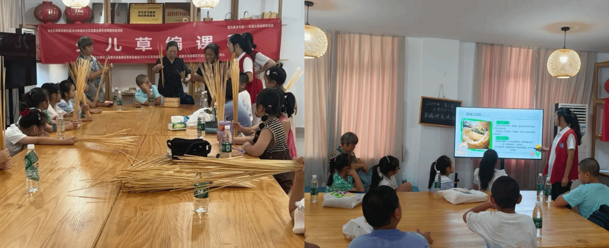童趣传承,梦想飞扬。团队以传承非遗为使命,面向社区小朋友开展趣味草编课堂,带领他们解码“草编里的文化密码”,从认识麦草,到学习基础技法,从手忙脚乱到渐入佳境,孩子们用草条一步步编出各式小图案,于欢声笑语里感受非遗魅力。借此,团队从“听”到“讲”,由“学”到“用”,思政教育从被动转化为主动,实现思政育人从“认知”到“内化”再到“践行”的深化。