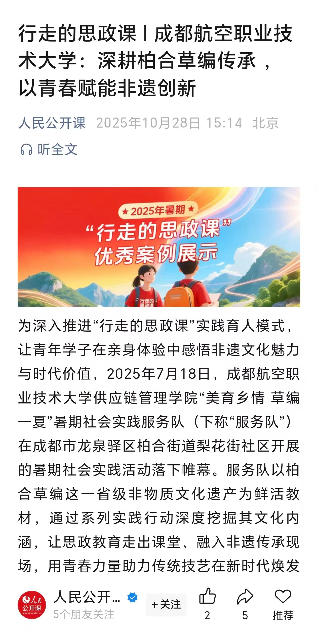 10月28日,在校团委的指导下,学校供应链管理学院“美育乡情 草编一夏”暑期“三下乡”社会实践服务队的非遗传承实践育人活动,获得了“人民公开课”微信公众号的转载报道。作为学校“行走的思政课”重点实践团队,这支队伍自2024年组建以来,扎根于省级非物质文化遗产“柏合草编”的发源地——成都市龙泉驿区柏合街道梨花街社区,开展了一系列富有成效的社会实践。