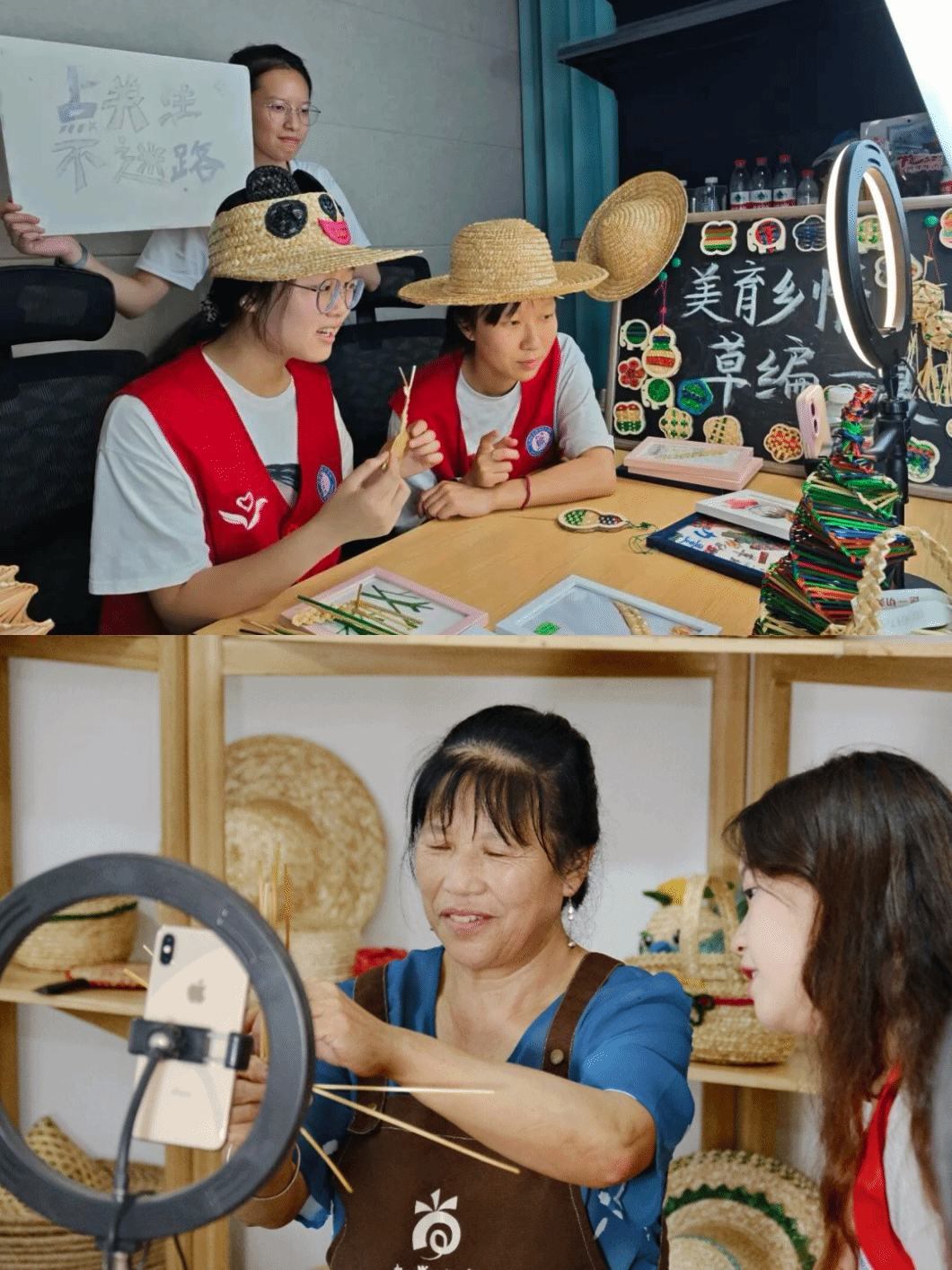 直播赋能,推广传播。团队以新媒体直播为创新路径,打造“草编手作直播专场”。镜头前,队员们一边演示草编编织技艺,一边讲解草编文化内涵,将传统技艺魅力与网络传播节奏相融合,推动柏合草编从线下走向线上。这不仅为非遗技艺开辟了数字化传播新窗口、新路径,吸引了更多人关注,更让队员们深刻理解了以青春实践守护与弘扬传统文化的意义。思政教育的养分,也在非遗传播创新中悄然滋养青年成长。