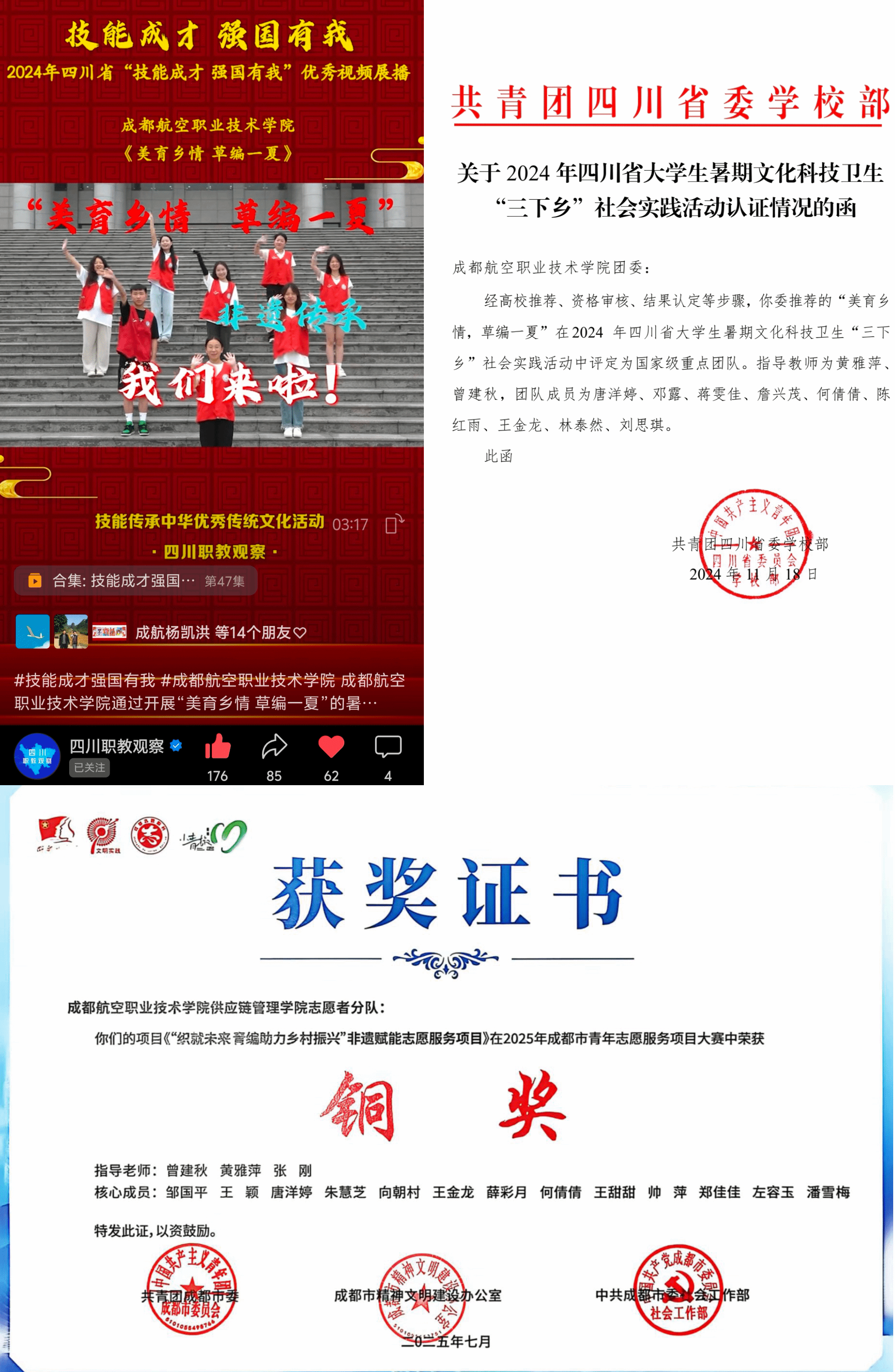 课堂“对接”,成果反哺。依托“社团-志愿-竞赛”三维能力平台,团队近两年持续将新建的“草编社”社团小课堂与“行走的思政课”这一社会大课堂对接融合,将技能训练与团队核心骨干培养同步推进,组建了一支“懂文化、会编织、能讲解、重思考”的师生队伍。通过及时总结经验,先后孵化了《草编里的文化密码》宣讲及研究报告、“世园会里的主题团课”——“非遗低碳”主题宣讲,以及“经纬非遗 草编新青年”与“织就未来 青编助力乡村振兴”等竞赛项目,获评2024年四川省大学生暑期文化科技卫生“三下乡”社会实践活动国家级重点团队,入选 2024 年四川省“技能成才 强国有我”优秀视频展播,获得2025年川渝大学生志愿服务项目大赛、成都市青年志愿服务项目大赛铜奖各1项,形成了“实践-竞赛-育人”闭环,逐步打造“行走的思政课”育人品牌。