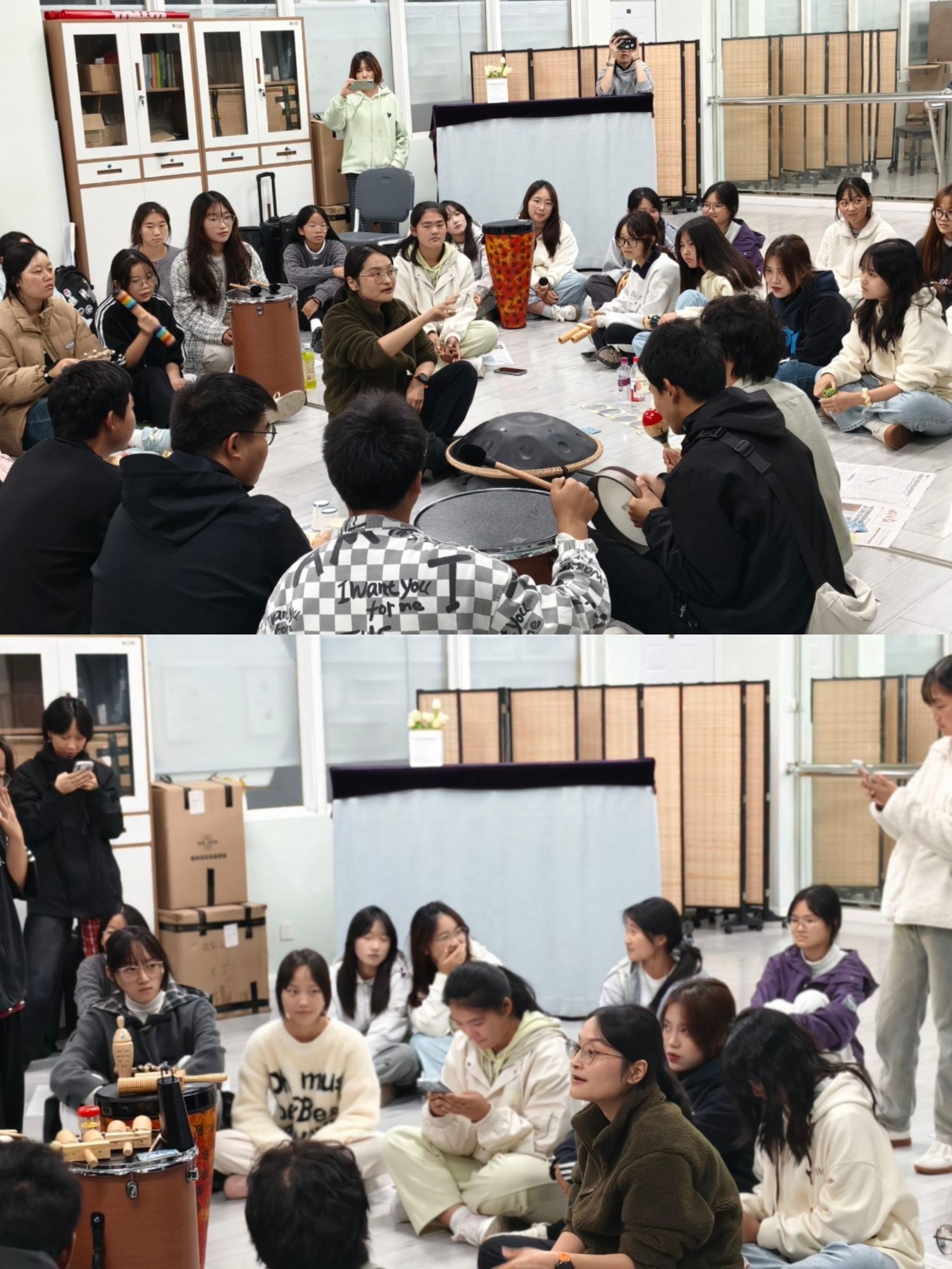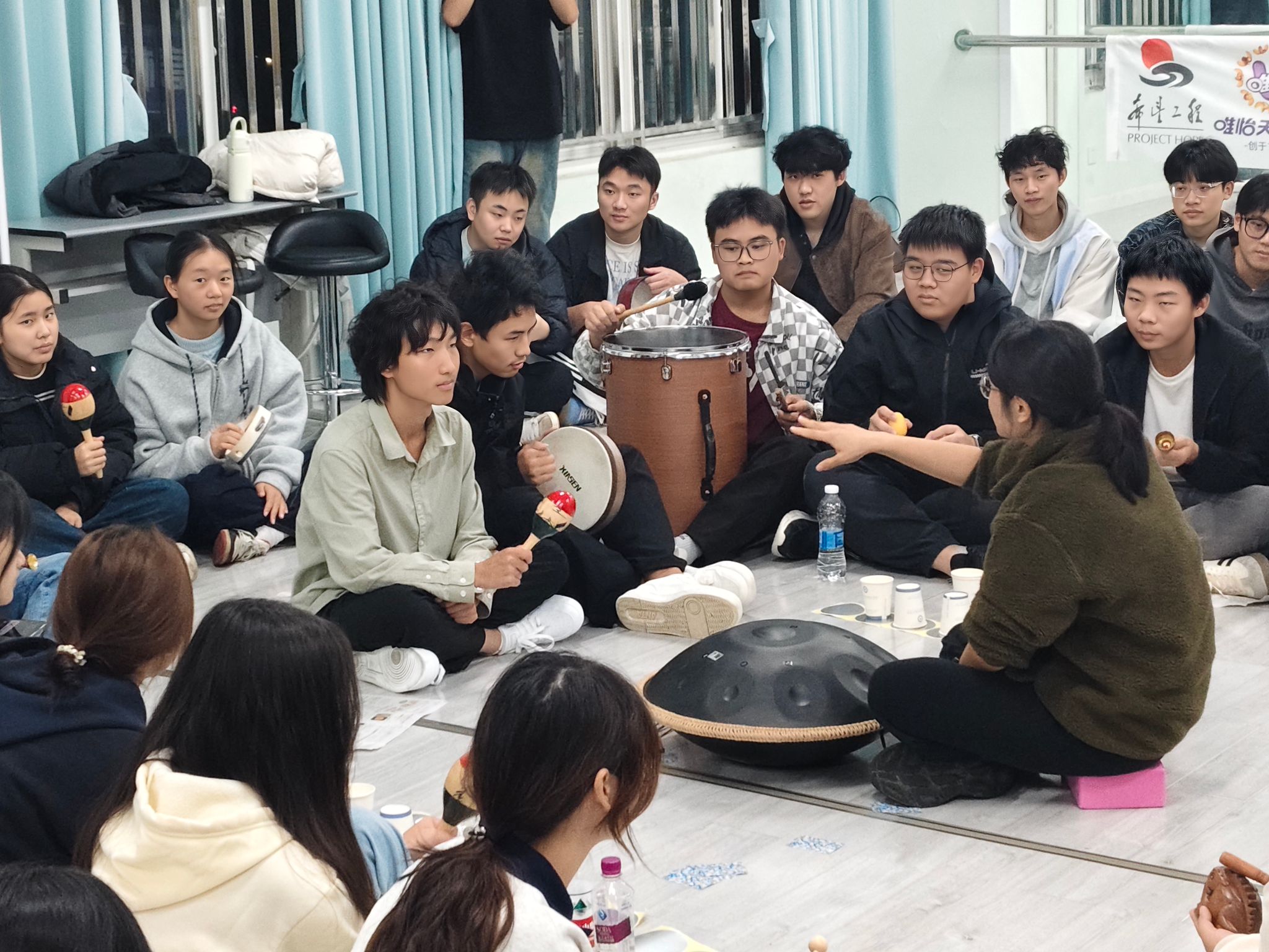 分享环节中,多名学生表达了参与感受。“跟着节奏敲击饭盒时,积压的焦虑仿佛随之消散,特别解压,”一名参与者分享道。另一位同学表示:“小组配合中的默契让人感到安心,原来压力可以这样轻松化解。”这些反馈体现了活动在情绪释放与团队联结方面的双重成效。