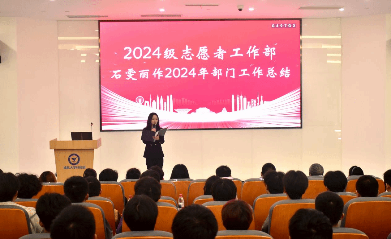 大会开场通过视频回顾2024级志愿服务的精彩瞬间,展现学院志愿服务体系的多元发展。2024级志愿者工作部负责人石雯丽以数据化方式总结年度工作,凸显志愿服务从校内基础服务延伸到校外专业支持乃至国际赛事协作的全面提升。