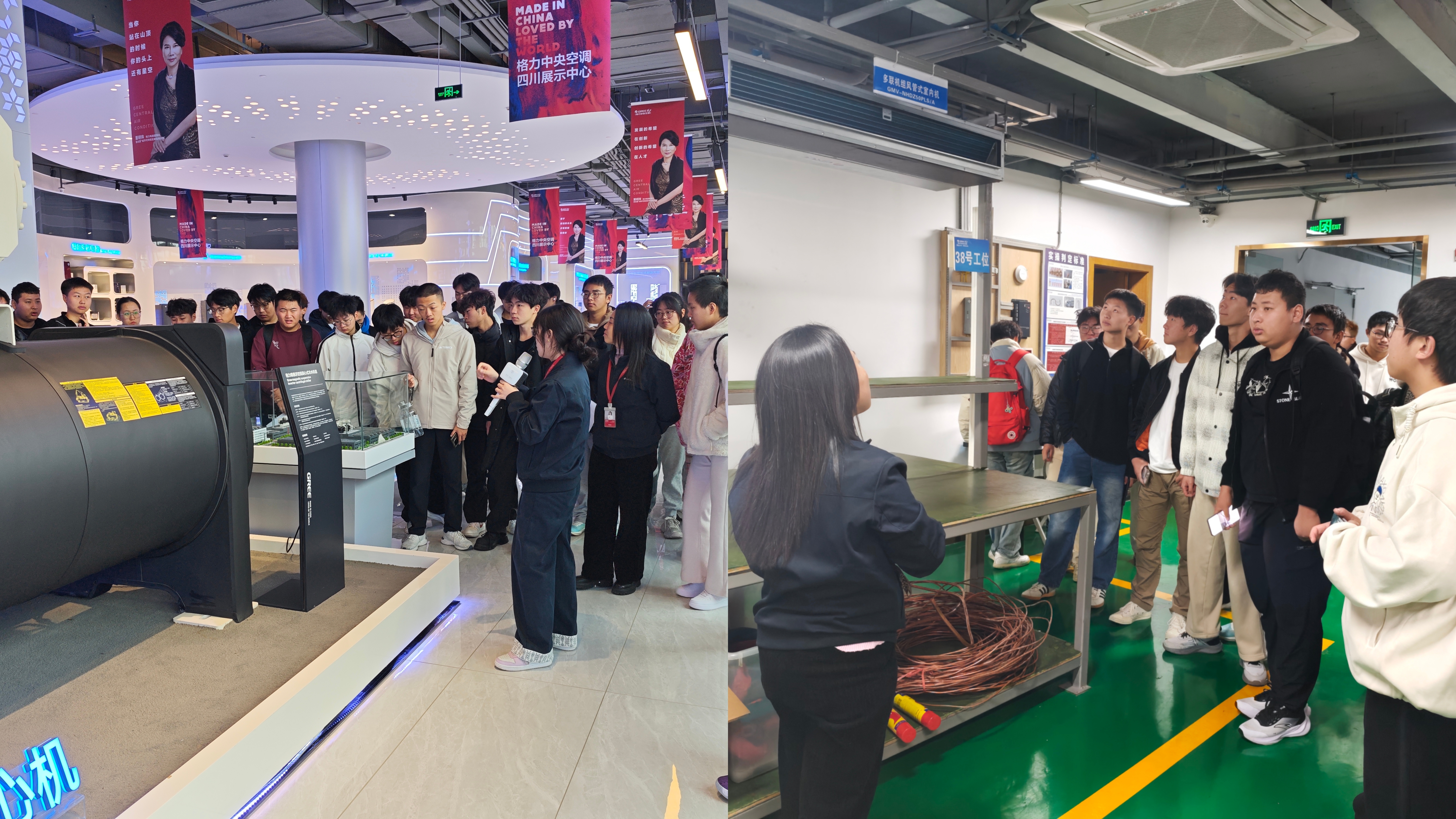 活动伊始,企业老师对格力公司的整体发展历程、企业文化以及在暖通空调领域的战略布局进行了系统介绍,为同学们勾勒出行业企业的宏伟蓝图。随后,讲解重点聚焦于专业核心领域,企业老师结合实物及系统模型,深入浅出地讲解了冷热源系统及其关键组成部分、多种形式的空调系统与设备运行原理;在智慧家居展区,集成了先进温控与空气质量管理技术的智能家电系统引发了同学们的浓厚兴趣;对于冰箱、洗衣机等日常家电中所蕴含的制冷与动力技术原理,企业老师也做了专业剖析。