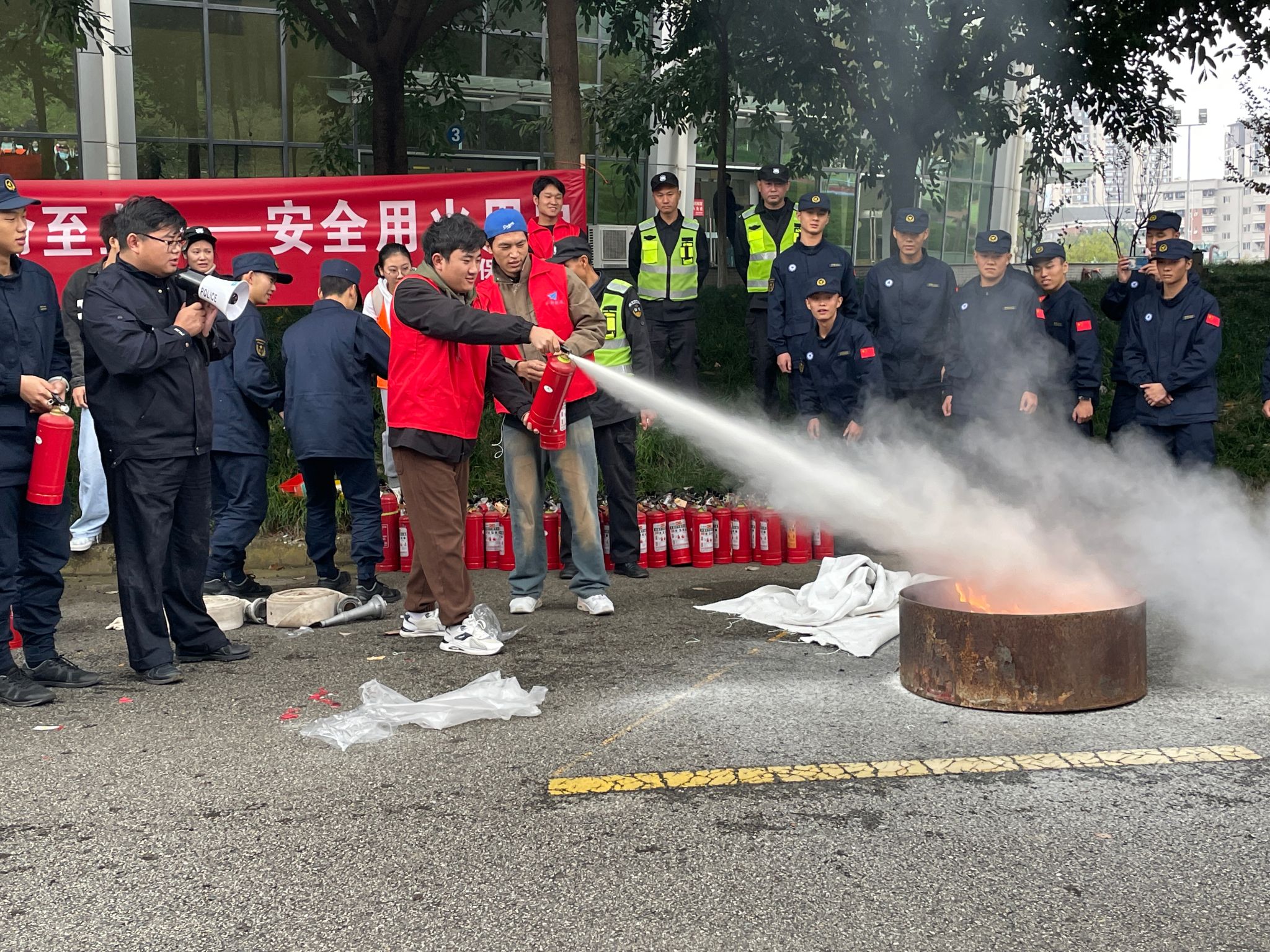 实操演练现场秩序井然、互动热烈。在工作人员的细致指导下,参训人员逐一实操灭火毯展开覆盖、干粉灭火器“提、拔、握、压”四步法,以及室外消防栓连接出水等关键技能,通过反复练习熟练掌握操作要领,有效提升初期火灾处置实战能力。