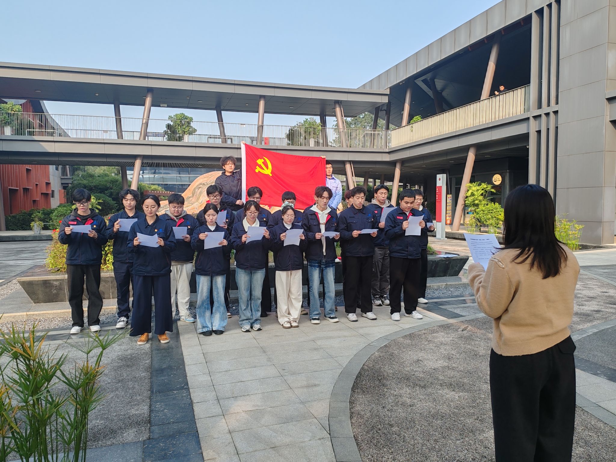 参观学习结束后,学院在博物馆前举行了庄重的“传家风・铸匠心”承诺书宣誓仪式。仪式由学生党支部书记蔡霞老师领誓,全体党员手持承诺书,庄严肃立在党旗下,铿锵有力的誓言不仅是党员师生对传承家风、践行匠心的郑重承诺,更是对扎根航空领域、助力制造强国建设的坚定表态。