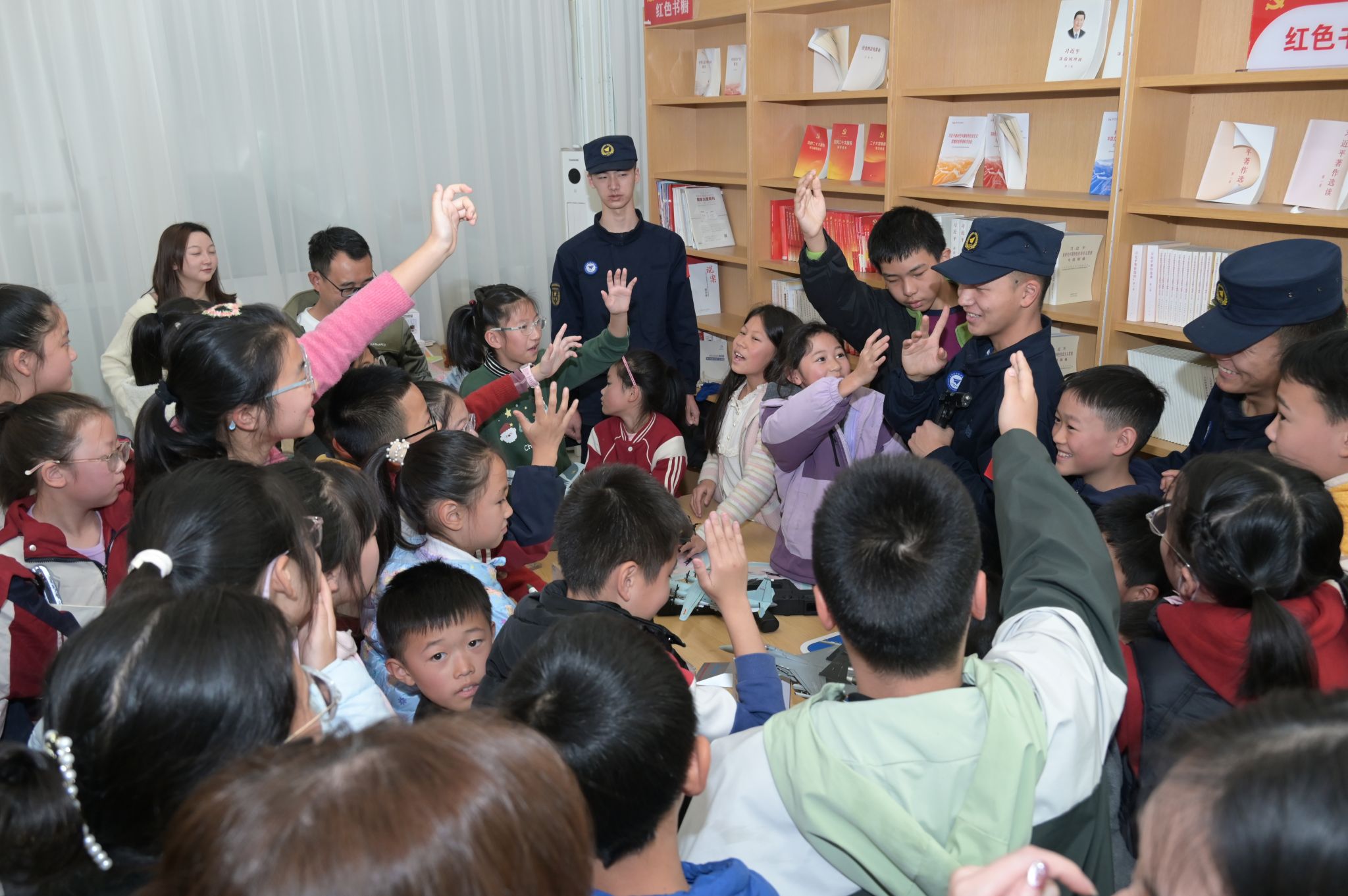 在国防教育与航空科技知识宣讲环节,宣讲团成员常季伟围绕我国国防装备、国家安全知识、军队人员组成等内容开展知识科普。通过通俗易懂的语言、亲切的表达和互动环节,为大家带来了一场精彩的知识盛宴。在问答互动环节,小朋友们纷纷举手抢答,现场气氛热烈。