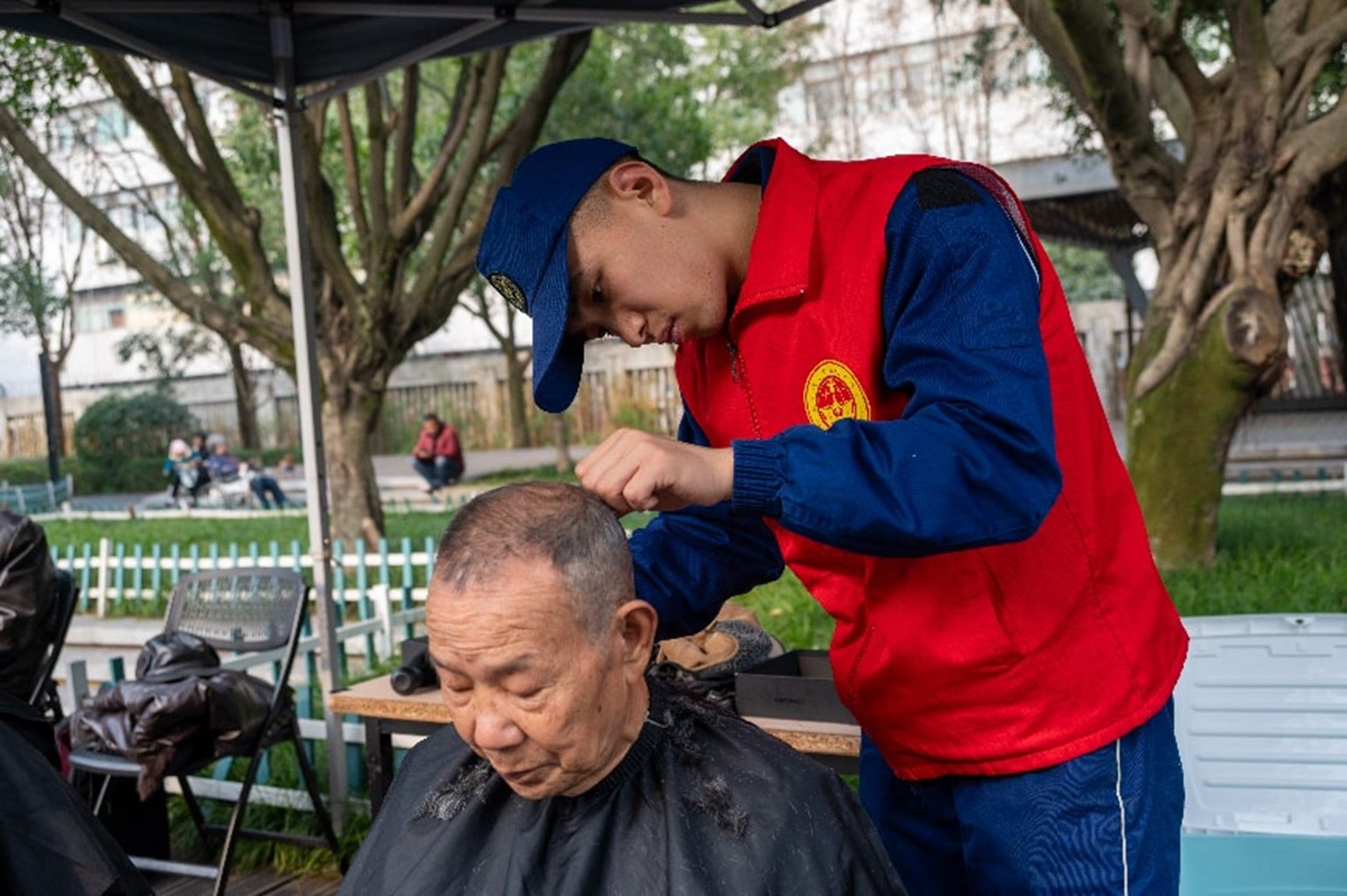 志愿者为社区居民理发