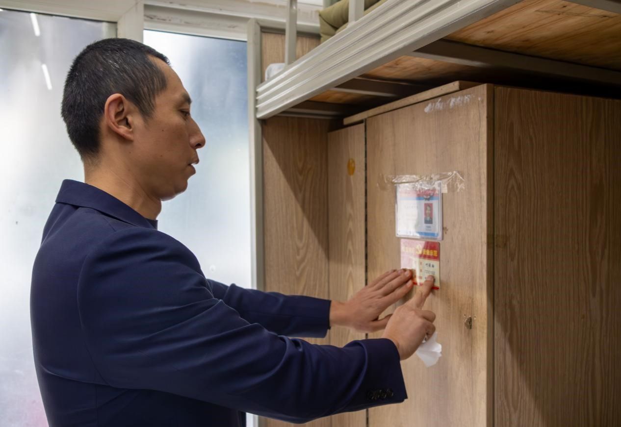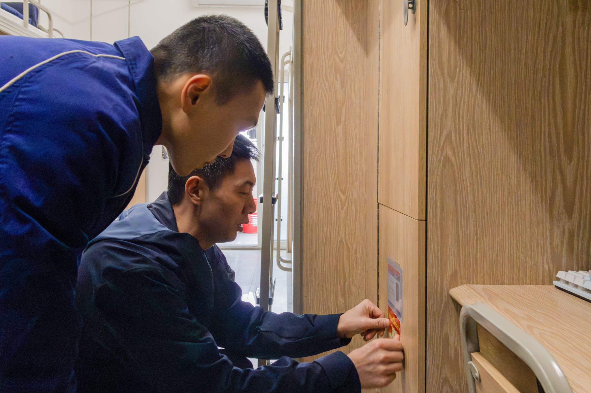 随后,老师们带队进入学生宿舍,逐一为学生党员张贴“党员模范寝室”标志牌,同时对营区秩序进行检查,提出存在的问题和整改措施。在活动过程中,老师们向学生党员寄予厚望,希望他们要时刻牢记党员身份,在寝室文化建设、学习训练、内务整理、遵章守纪等方面起好带头作用,同时要心系集体,主动帮助同学解决身边难题。