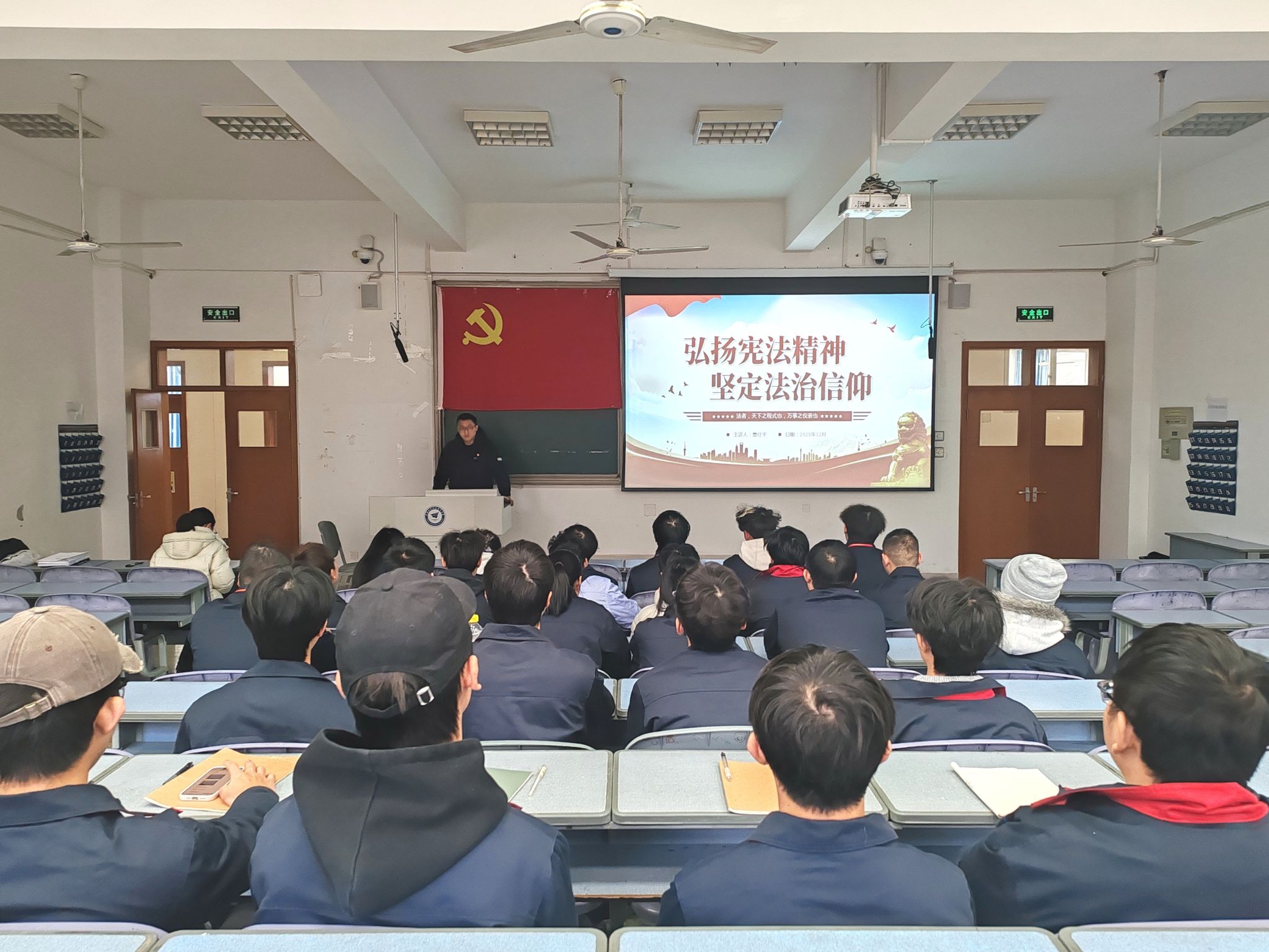 为深入学习贯彻习近平法治思想,大力弘扬宪法精神,进一步强化学院学生的宪法意识与法治素养,12月30日下午两点,学院党建工作负责人曹仕平在尚学楼2-208教室以“弘扬宪法精神,坚定法治信仰”为主题讲授专题党课。本次党课由学生党支部书记蔡霞主持,全体学生党员、预备党员及入党积极分子参加。