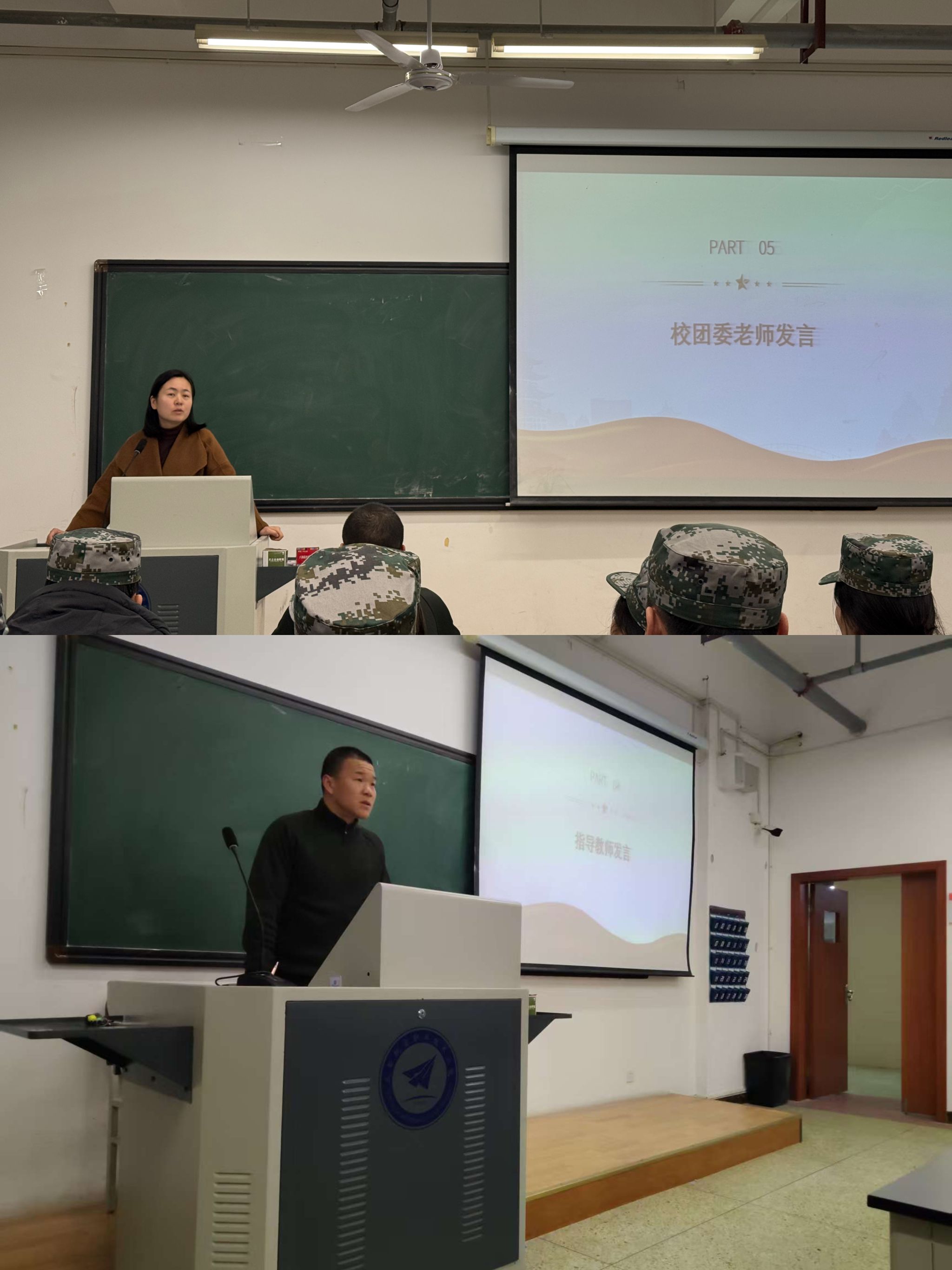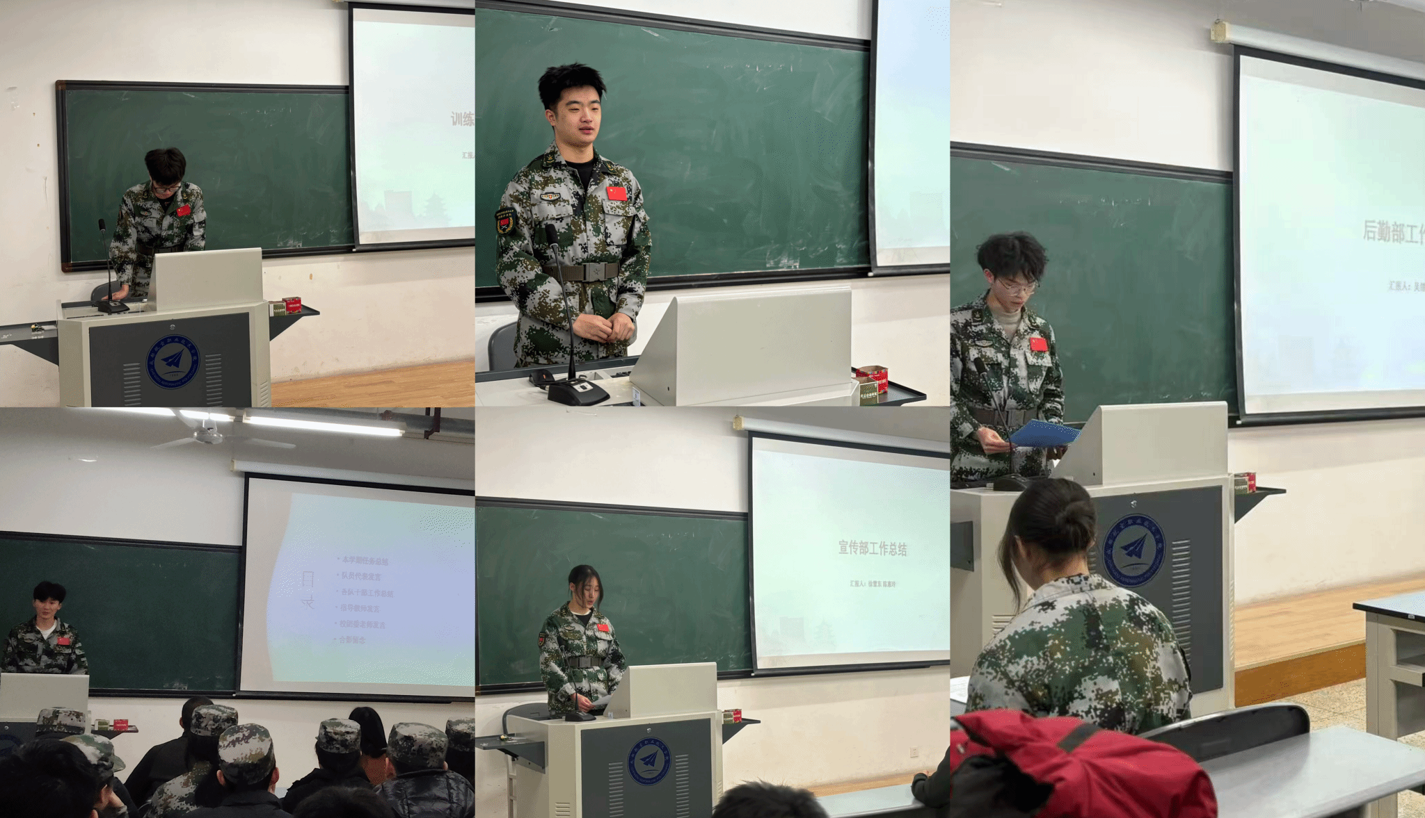 国旗护卫队队长、航空维修产业学院2024级学生龚胡帅安全面汇报本学期工作进展。训练部聚焦“夯实基础、提升质效”,通过“一对一帮扶、集中纠错”机制确保全员进步;宣传部系统记录训练任务与活动瞬间,强化队伍形象传播;后勤部高效保障两校区训练及任务开展,为队伍运行提供坚实支撑。