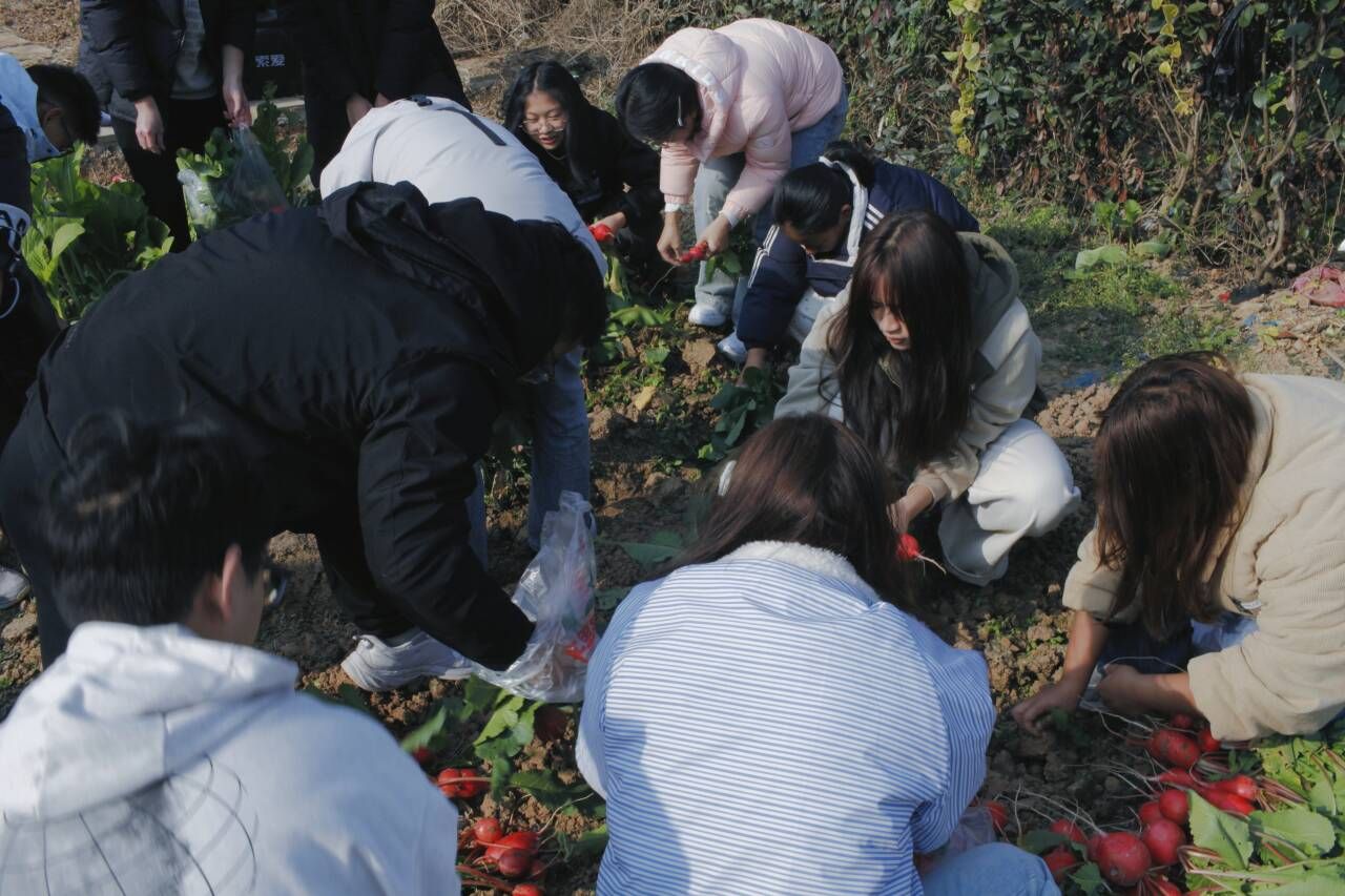 “收获的不只是作物,更是协作中的成长与汗水后的喜悦。”活动在主持人轻快的开场中拉开序幕。学工部劳动课程负责人罗惠击鼓宣布采收开始,各小组迅速进入“责任田”,开展作物采收与土地翻整。田埂间身影忙碌,锄起铲落间不仅是劳动的节奏,更是理论与实践的真实交融。同学们俯身细采、挥锹翻土,在寒日暖阳中勾勒出一幅生动蓬勃的“劳动画卷”。
