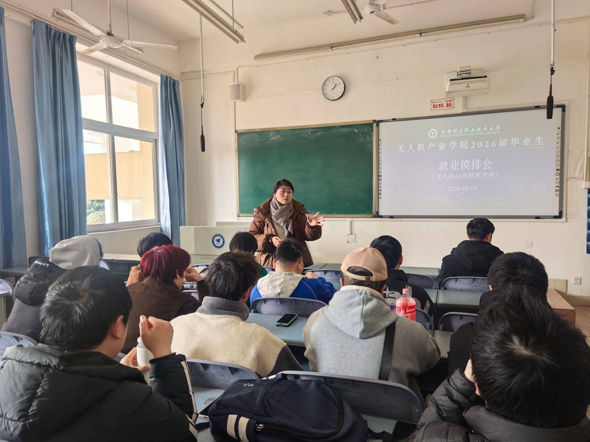为贯彻落实学校关于毕业生就业工作的要求,扎实做好2026届学生就业工作,1月9日中午,无人机产业学院在尚学楼202室针对无人机应用技术专业召开2026届未就业学生精准摸排工作专题会议。学院学生工作负责人孔萍主持会议,学院党建工作负责人张应培、无人机应用技术专业毕业班辅导员和未就业学生参加会议。