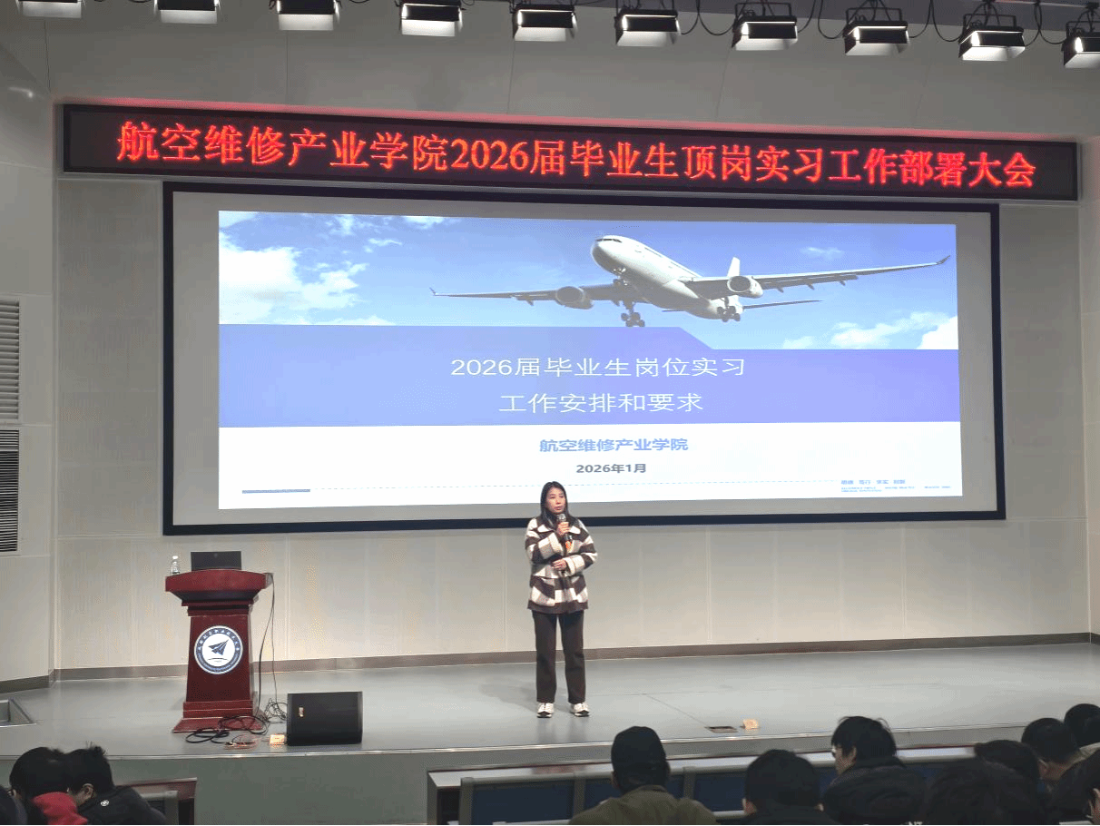 2026年1月14日,航空维修产业学院在博学楼笃行报告厅召开2026届毕业生岗位实习工作部署大会。学院教学工作负责人葛剑、学生工作负责人张伟瑞及毕业班辅导员出席大会,会议由刘联晗主持。