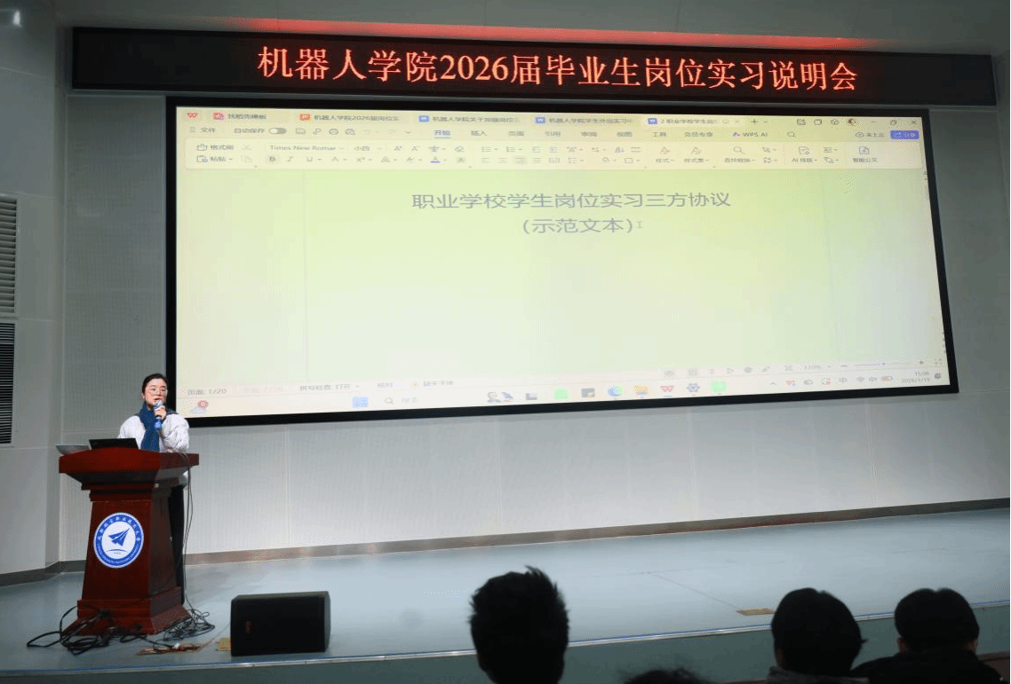 本次大会系统部署了2026届毕业生岗位实习各项工作,不仅强化了学生的实习观念与安全意识,明确了顶岗实习的工作要求与职业道德规范,更引导学生树立正确的工作态度,激发其投身职场的积极性与主动性。下一步,机器人学院将持续加强实习过程管理,完善跟踪指导机制与服务保障体系,切实保障学生实习期间的学习成效与人身安全;学院也将全力夯实毕业生就业工作基础,协助学生将理论知识转化为实践能力,提升综合素养,为顺利开启职业生涯奠定坚实基础。