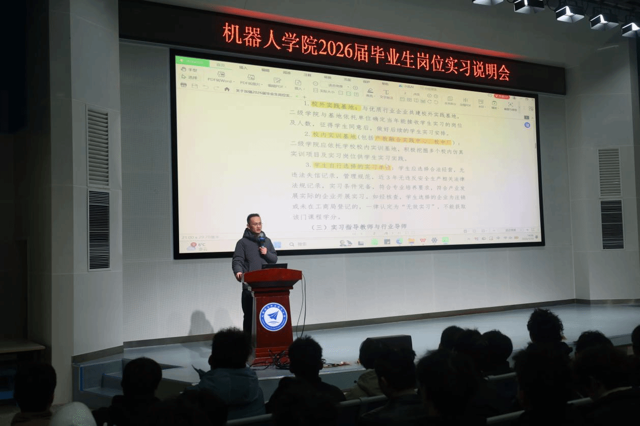 为扎实做好毕业生岗位实习工作,引导学生明确实习目标、提升安全意识、保障实习质量,2026年1月19日下午,机器人学院在博学楼报告厅召开了2026届毕业生岗位实习动员暨安全教育大会。学院党委负责人曹鼎、教学负责人梁亚峰、毕业班辅导员及2026届全体毕业生参加,杨维主持会议。