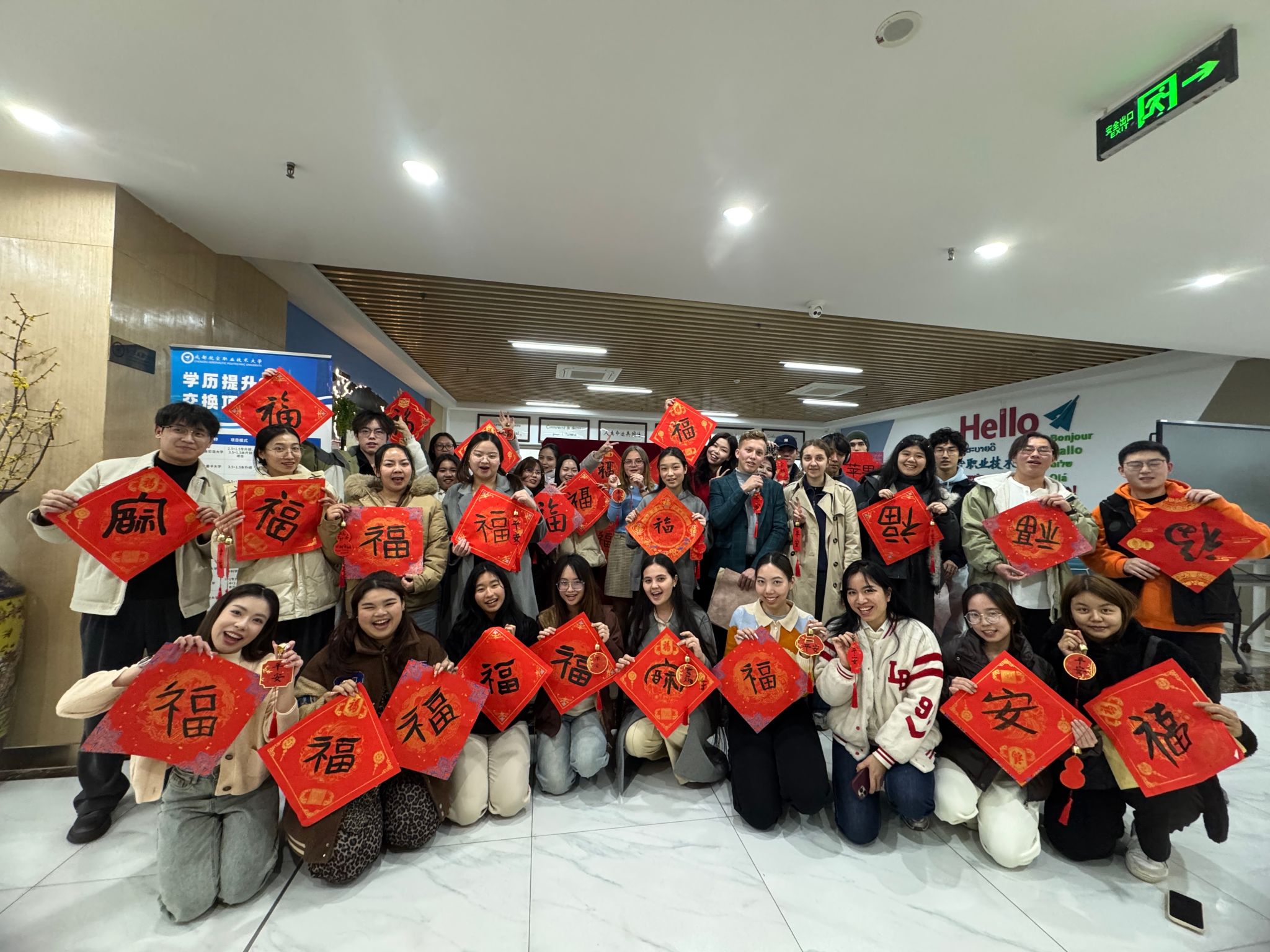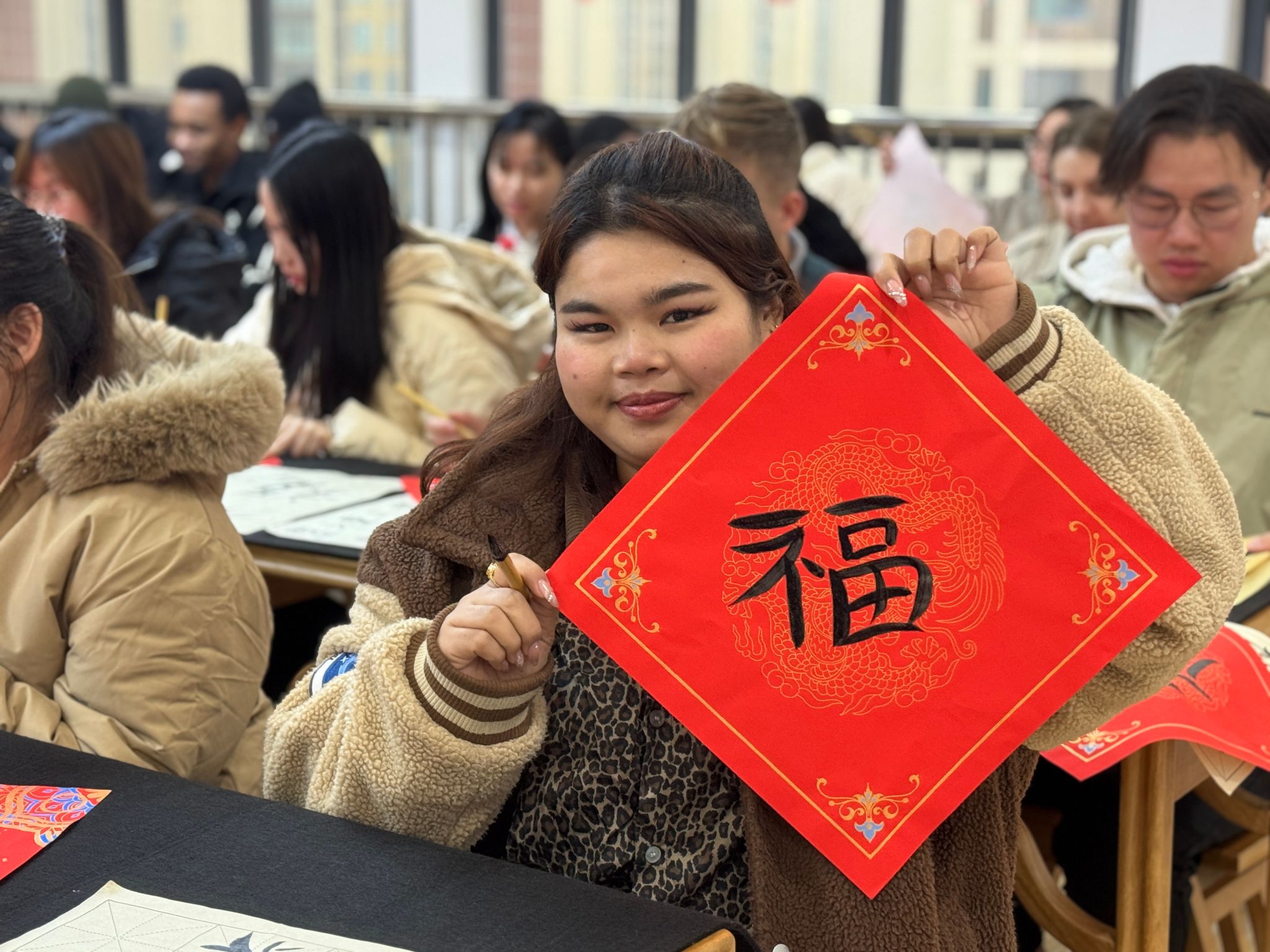 留学生们手持自己亲自书写的祝福卡片、各式各样的“福”字,欣喜地展示着自己的成果,并与伙伴们互相学习点评。活动最后,全体参与者手持各自书写的新年祝福,在作品展示墙前合影留念,记录下这充满文化韵味与友谊温馨的瞬间。