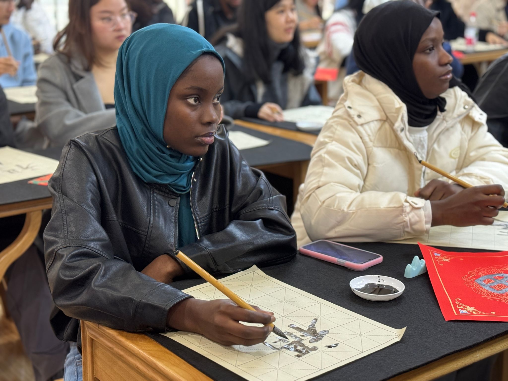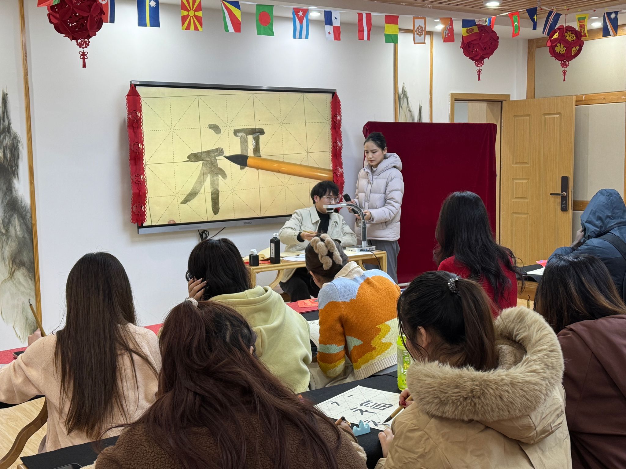 活动伊始,温馨的中国风音乐营造出宁静雅致的氛围。留学生管理老师向同学们致以诚挚的新年问候,并简要介绍了书法作为中国文化瑰宝的独特魅力与精神内涵,拉开了此次文化体验活动的序幕。