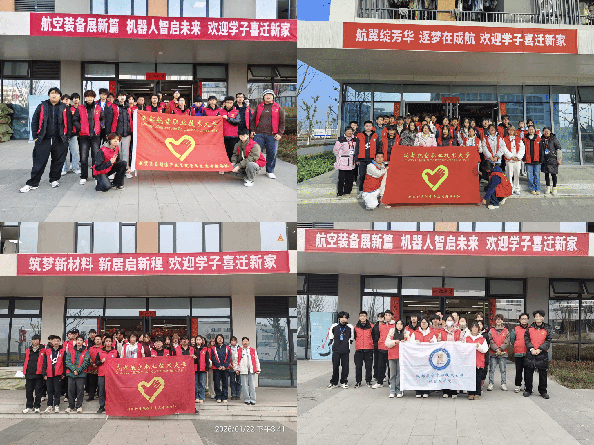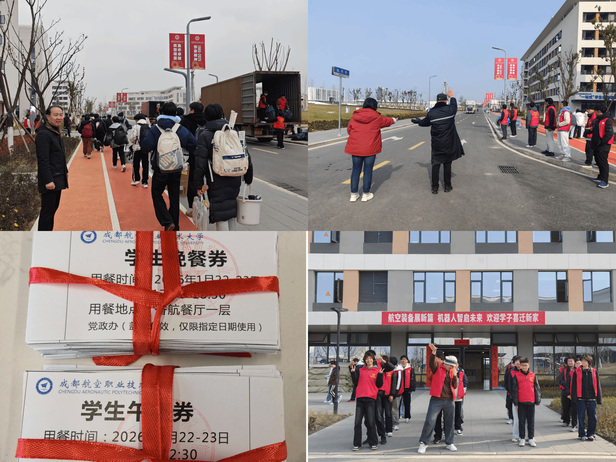 1月22日、23日,成都航空职业技术大学航空装备制造产业学院、新材料学院、机器人学院450余名2024级学生,在学校的统筹安排下,分批次、分时段完成了新都校区的搬迁入住。搬迁现场规范有序,志愿者的热忱服务更是全程相伴,为这场青春的“迁徙”注入了满满暖意,也为成航学子们的新校园生活拉开了温馨序幕。