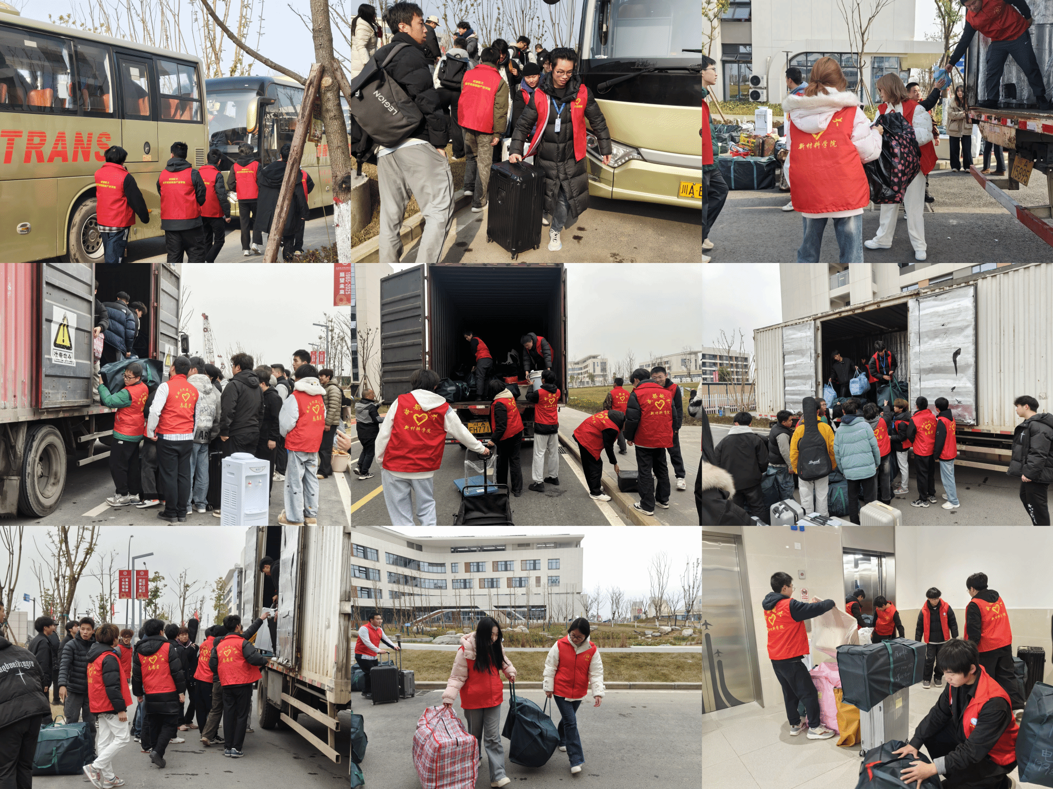 搬迁现场,身着红马甲的志愿者们成为一道亮眼的风景线。他们早早到岗,分布在转运车辆旁、新都校区宿舍楼下等关键位置,主动帮同学们搬运行李、指引路线,耐心解答入住相关的疑问。一句句亲切的问候、一次次务实的帮扶,让大家在搬迁过程中少了奔波的疲惫,多了冬日里的温暖,也让校园里的互助氛围愈发浓厚。