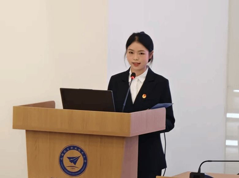 2025级新能源汽车工程技术专业学生廖艳代表发言,代表全体参训学员郑重承诺:将坚定理想信念,深学细悟党的创新理论;勤学专业本领,立足汽车专业前沿苦练技能;严守纪律作风,以党员标准严格要求自身;勇于担当奉献,把个人理想融入民族复兴与汽车强国建设,以实际行动向党组织靠拢。