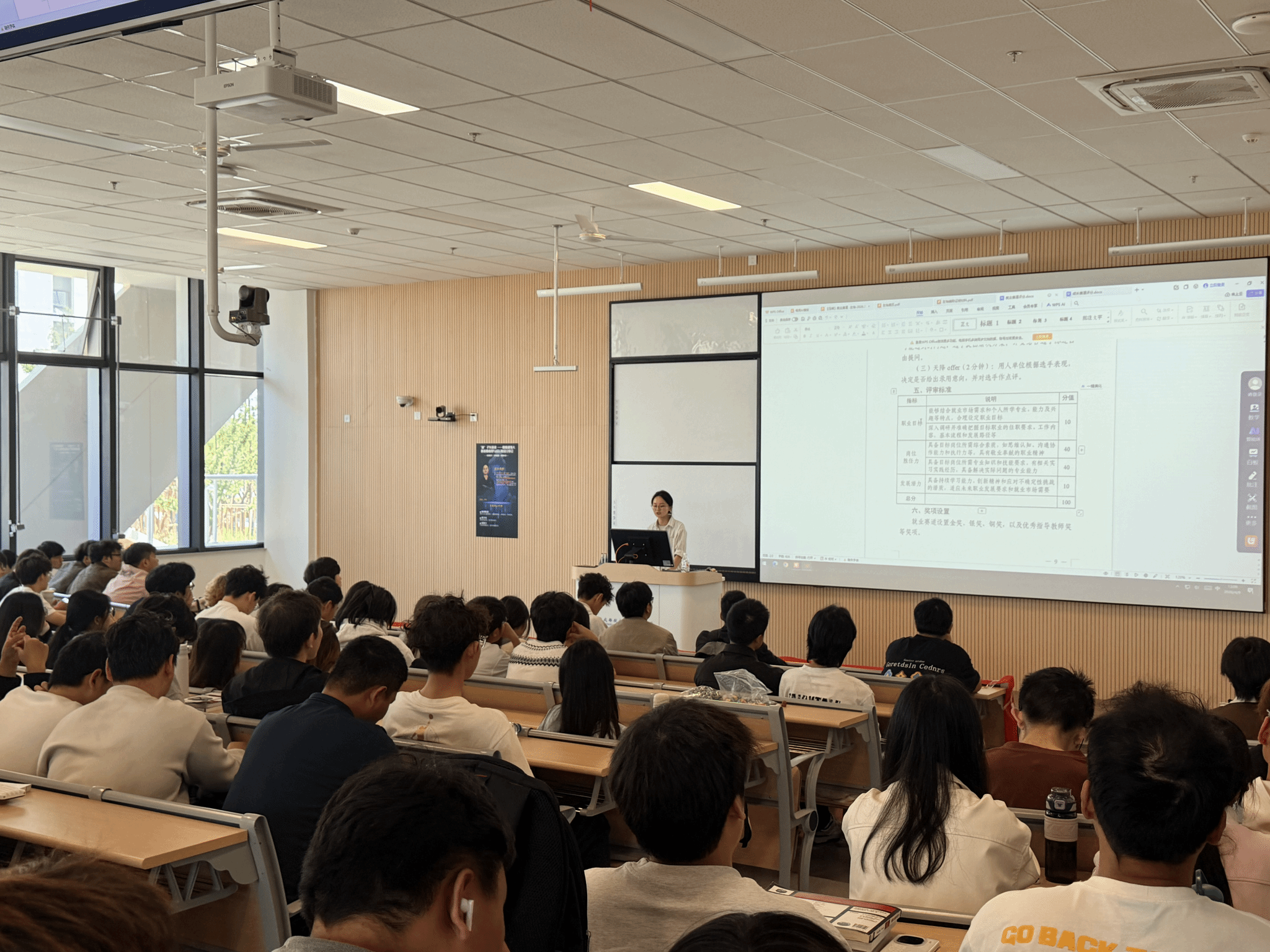 在分享中,左怡详细拆解了大赛备赛要点:从就业赛道(岗位胜任力占80分)与成长赛道(侧重认知与潜力)的评分差异,到PPT“职业目标+岗位胜任力+发展潜力”三大核心板块的搭建逻辑;从必备材料(PPT、展示视频、简历、辅助证明)的准备技巧,到评委高频提问“实习中遇到的困难及解决方案”的应答思路,均结合自身实战经验给出具体指导。她特别分享了自己在大二时用5分钟完成42页PPT讲解的控时训练、以及熬夜整合辅助材料的经历,传递出“敢上台、敢尝试、专注当下”的备赛态度。