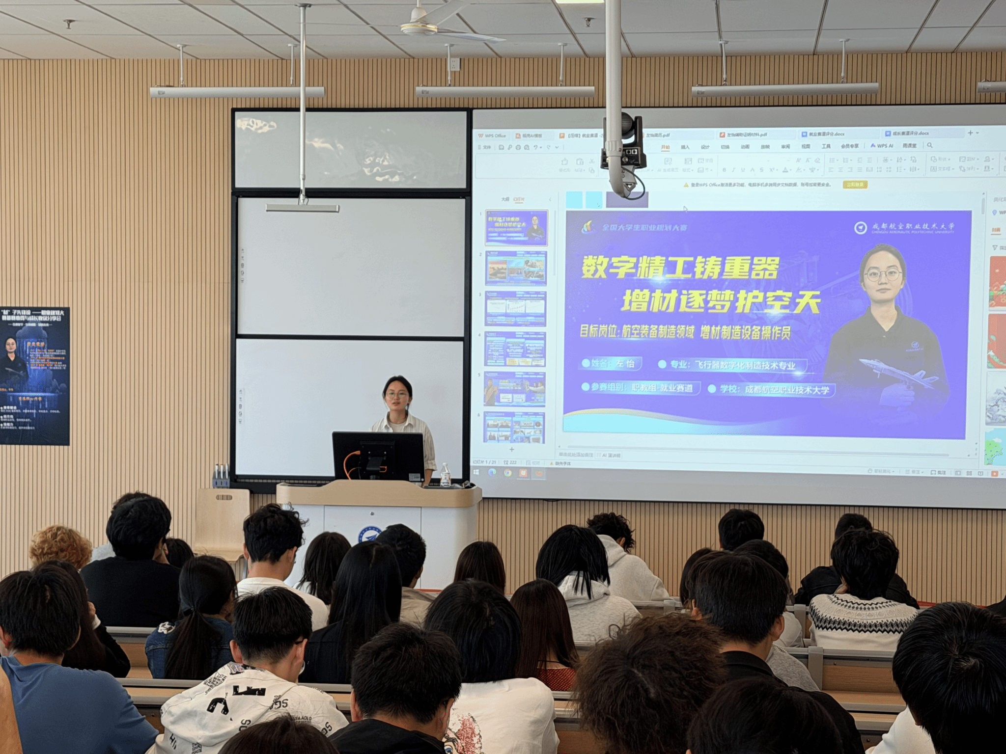 左怡从自身“飞行器数字化制造技术”专业跨向“增材制造设备操作(3D打印)”的转型历程切入,生动阐述了职业规划大赛的核心逻辑。她指出,该赛事的重点不在于展示专业技能的深度,而是在于考察参赛者的岗位胜任力与实践匹配度。她鼓励同学们打破“专业限定岗位”的固有认知,挖掘技术的多元应用场景,正如3D打印技术可广泛服务于医疗牙冠、术前导板等医工结合领域,制造技术同样可以成为连接不同行业的桥梁。