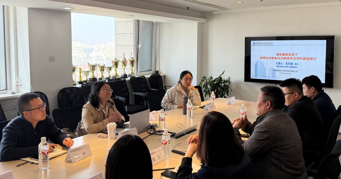 下午,调研团队前往建研建材公司开展进一步调研交流。建研建材有限公司副总工程师王万金教授、智能监测事业部主任袁玉一行进行交流。座谈会上,王万金详细介绍了公司发展概况、核心技术成果及行业布局,重点展示了“AIIES”智能检测体系,包括无人机、高频雷达、爬壁机器人、地面级远程光学扫描仪等先进检测装备,以及这些装备在超高层建筑、老旧小区、历史建筑等领域的实践应用案例。