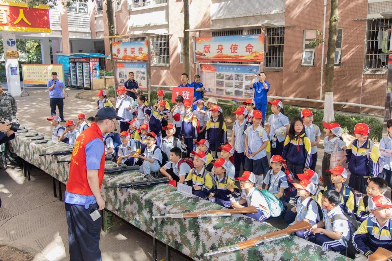 活动全程以“实景展示+沉浸体验+专题授课”的模式层层推进。开场的队列会操与基础战术科目演练中,学校定向培养军士军容严整、作风过硬,摆臂踢腿整齐划一,战术动作刚劲有力,嘹亮口令响彻全场,以过硬军事素养与严明纪律作风赢得师生阵阵掌声;随后的多维度研学环节有序铺展,国防装备展示区里,志愿者结合枪械模型讲解轻武器构造与国防装备发展知识,让同学们直观感受国防科技力量;内务规范体验区内,定向培养军士现场示范军被标准化叠制流程,一对一指导学生实操,在实践中培育严谨作风与规矩意识;航空模型展区中,工作人员结合战机模型讲解航空科普知识与中国航空工业发展历程,点燃孩子们逐梦蓝天的热忱;下午的实景研学环节,师生们走进航空馆、踏上停机坪,从航空发动机实物拆解的动力原理,到各型战机、直升机的机身结构与机载设备功能,沉浸式触摸航空工业发展脉络;研学尾声的国防知识专题讲座,系统阐释我国国防力量发展历程与辉煌成就,进一步深化了同学们对新时代国防建设的认知理解。