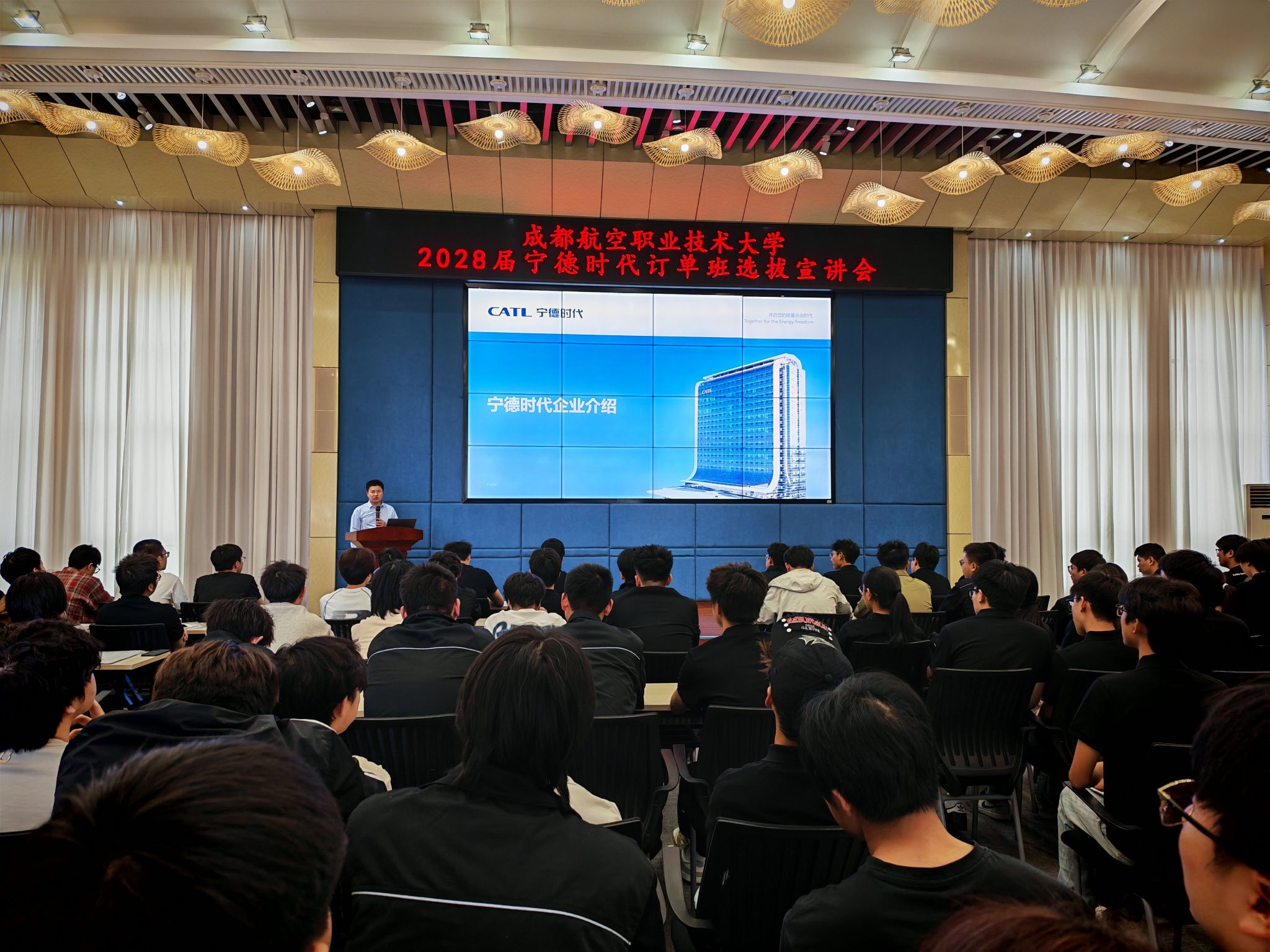 4月21日下午,宁德时代运营中心主任工程师韩红攀一行来到成都航空职业技术大学,在求实报告厅举办2028届宁德时代订单班选拔宣讲会,汽车工程学院相关专业学生到场参加,了解企业岗位需求和订单班的培养方式。