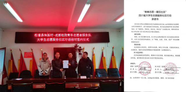 12月5日国际志愿者日当天,在学校乡村振兴工作领导小组指导联系下,共青团成都航空职业技术学院委员会与松潘县纳坡村、埃溪村2个村分别签署“青春志愿·爱在社区”大学生志愿服务社区结对承诺书。同时,在共青团龙泉驿区委联合下,与龙泉驿区柏合街道11个村(社区)完成大学生志愿服务村(社区)结对。