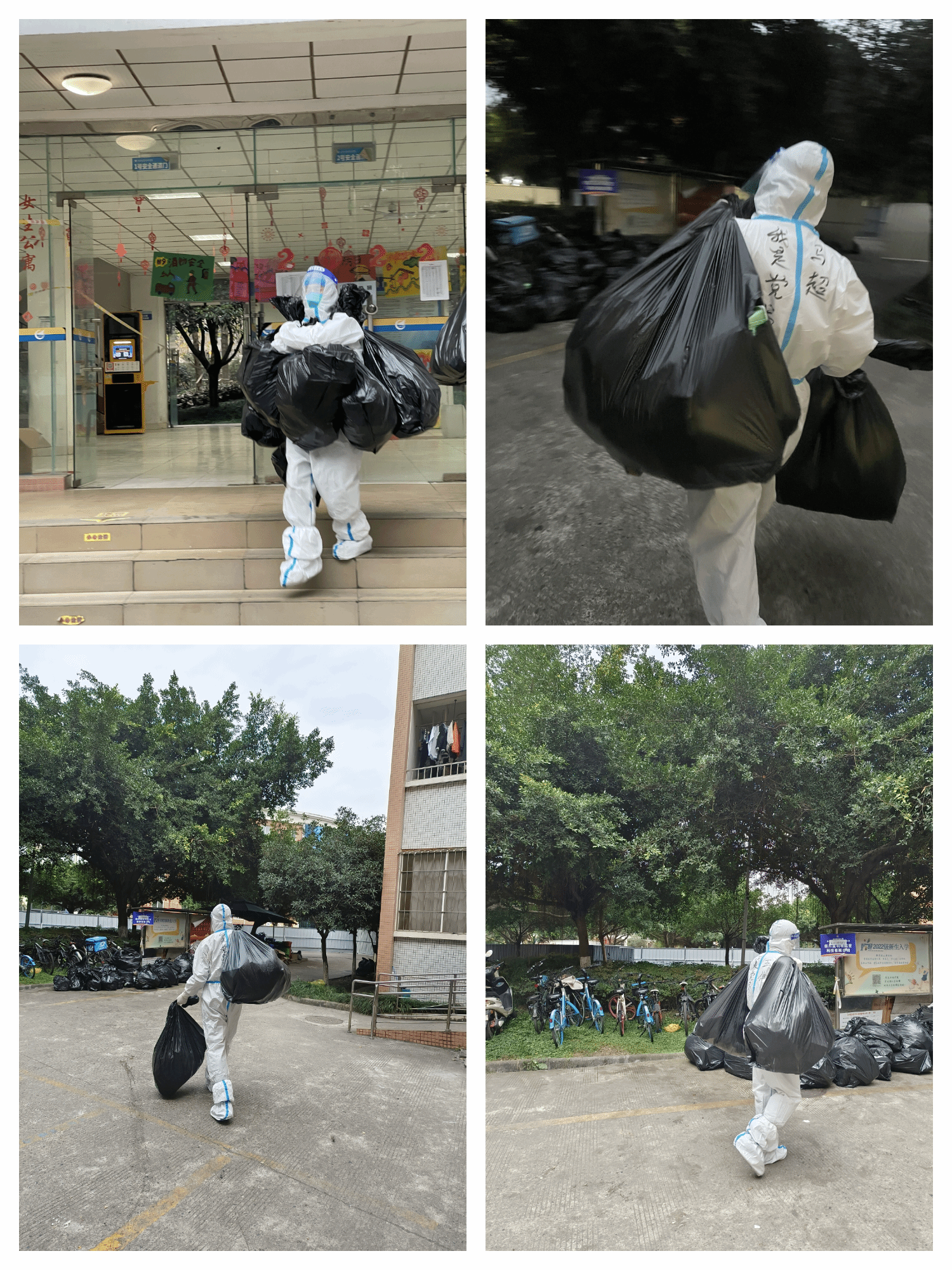 自11月24日以来,志愿者老师们一直坚持奋斗一线,一趟趟从一楼往上送学生们的餐食,6个楼层,每个楼层28个房间,最艰难的楼层,需要上下楼梯上百次才能完成一次送餐。每完成一餐,老师们的衣服都已被完全打湿。除了要圆满完成送餐任务,10栋由于是女生寝室,也存在部分个性化需求,由辅导员反馈至楼长处,由楼长分配完成配送,保障学生们的基本生活。除了送餐,老师们还要负责清理每日堆积的垃圾。一趟趟的跑上去,再一趟趟的跑下来,老师们却从不曾说过辛苦。