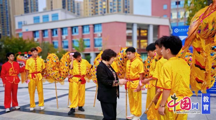 舞台区域同样亮点频现。龙狮队带来的舞龙表演气势磅礴,金黄与红色的龙身在灯光下灵动穿梭,展现出非遗文化的独特魅力;音乐协会与歌咏社接连献唱,动人旋律引发全场共鸣;CDHY舞社的韩舞表演活力四射,大学生艺术团的压轴演出更以专业水准赢得阵阵掌声。表演结束后,陈小红向表演者致以亲切慰问,肯定大家将传统技艺与校庆氛围完美融合的创意,鼓励同学们继续传承和弘扬中华优秀传统文化,在校园里营造更浓厚的文化氛围。
