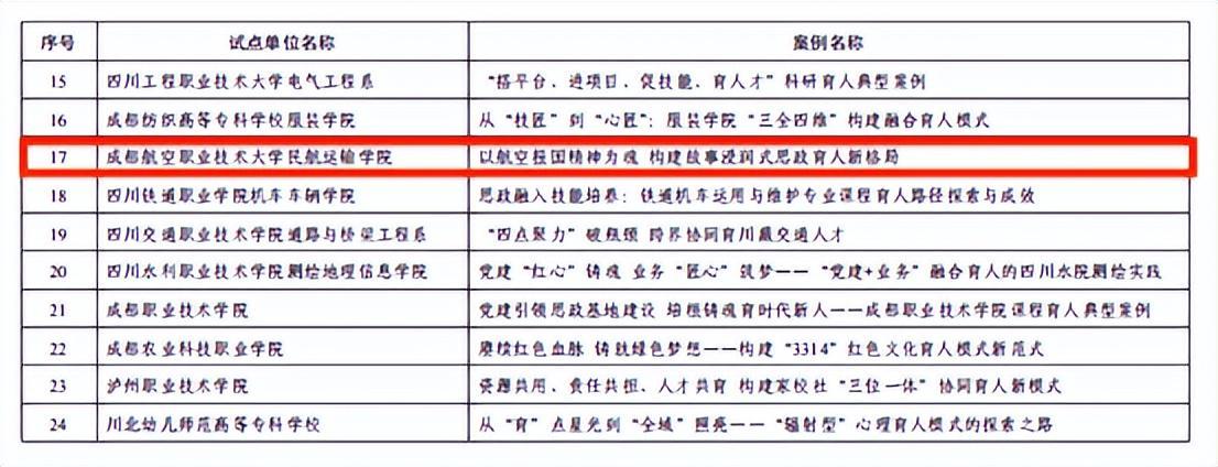 近日,中共四川省委教育工委办公室公布了第二批、第三批“三全育人”综合改革试点总结评审结果,成都航空职业技术大学(以下简称:成航)“三全育人”工作再获重要认可。经组织专家评审、复核等程序,第二批20个试点高校、37个试点院(系)和第三批13个试点高校、52个试点院(系)通过试点总结;7所高校、17个院(系)提交的典型案例评选为优秀典型案例。其中,成航航空维修产业学院通过四川省第二批“三全育人”综合改革试点总结,民航运输学院通过第三批试点总结,其报送的《以航空报国精神为魂 构建故事浸润式思政育人新格局》获评省级优秀典型案例。
