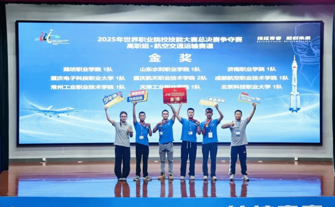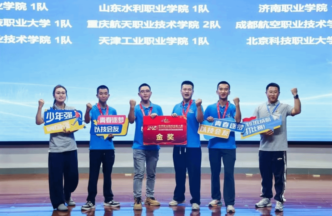 成航无人机产业学院参赛团队获2025年世界职业院校技能大赛总决赛争夺赛航空交通运输赛道高职组金奖(从左至右依次是指导教师张嘉麟,参赛学生蓝雨晨、秦勇川、王传栋、聂日美,指导教师王玺鉴)
