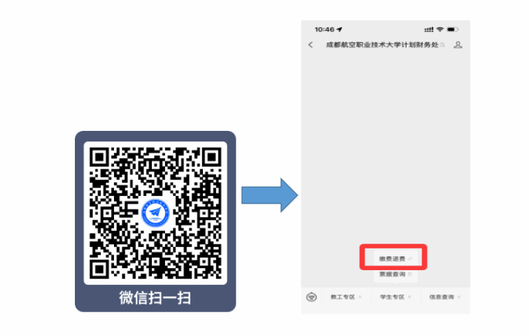 Step1:关注“成都航空职业技术大学计划财务处”微信服务号(微信搜索或扫描下方二维码),点击页面下方的“学生专区”→“缴费退费”菜单进入登录界面。