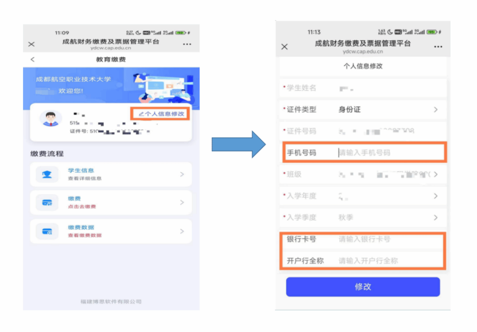 3.操作流程:登录“成都航空职业技术大学计划财务处”微信服务号,在“学生专区”--“缴费退费”--“个人信息修改”中完成银行卡信息采集(具体流程见附件)。
