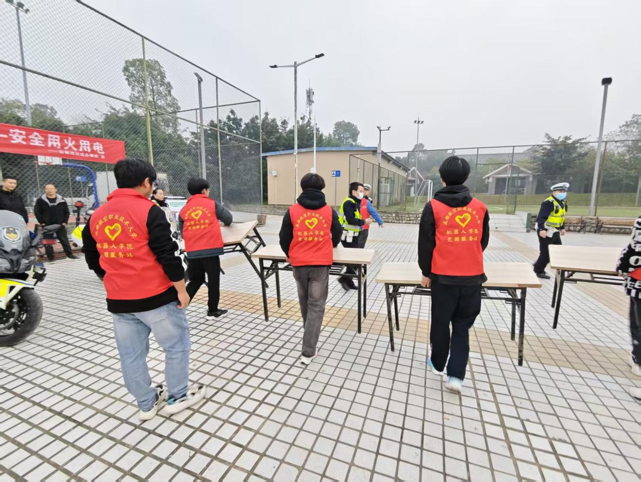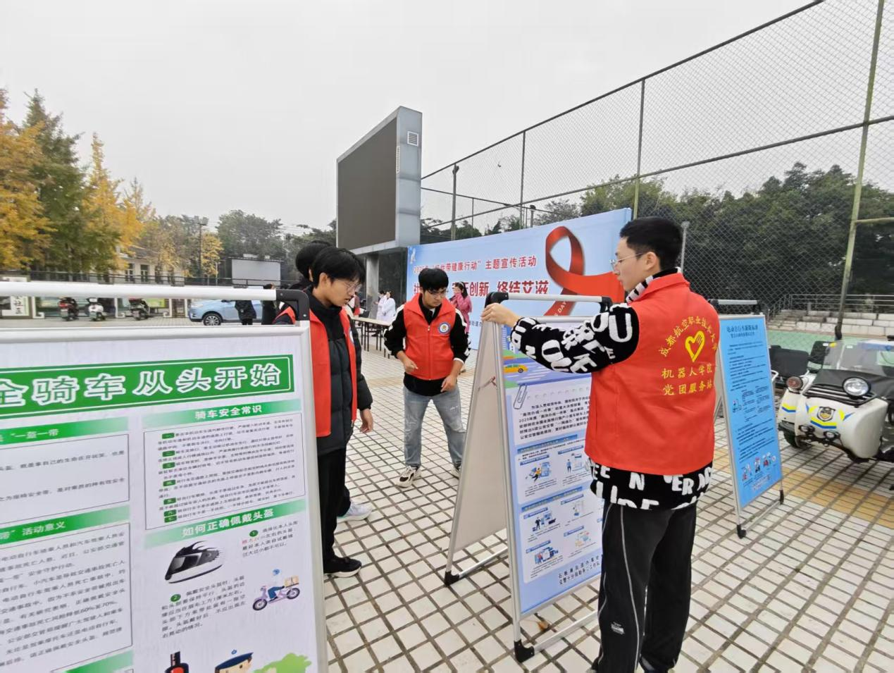 清晨8时30分,天色微明,志愿者们已准时抵达石板滩文化广场。寒风中,大家迅速投入场地布置工作:男生们两两一组,将沉重的长桌和一个个的椅子从社区仓库抬出,平稳摆放在广场中央;按照活动的布局整齐排列。最引人注目的是那一排排交通安全宣传立牌——"一盔一带,安全常在""礼让行人,文明出行",志愿者们认真调整着每个立牌的角度,确保过往行人能清晰阅读。志愿者们蹲在立牌前,用帕子擦拭晨露打湿的表面;当最后一个立牌在朝阳下熠熠生辉,大家虽已双手通红,却相视而笑——这无声的默契,是成航学子"严谨务实"作风最生动的注脚。