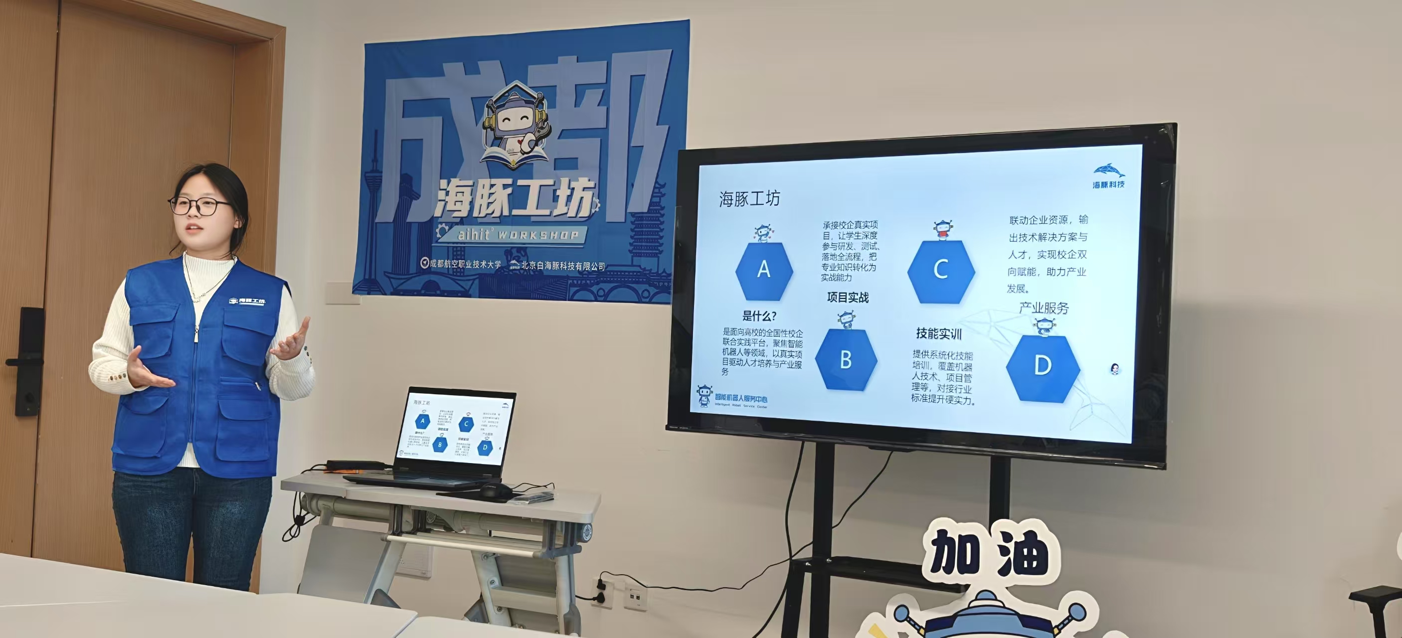 1月8日,成都航空职业技术大学(简称:成航)携手北京白海豚科技有限公司(简称:海豚科技)合作成立的智能机器人城市服务中心学生服务团队——海豚工坊正式成立。海豚科技总经理李昭、区域经理徐建辉出席成立仪式,活动由机器人学院党组织负责人曹鼎主持。