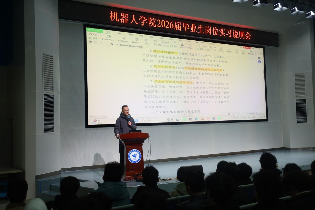 为扎实做好毕业生岗位实习工作,引导学生明确实习目标、提升安全意识、保障实习质量,2026年1月19日下午,机器人学院在博学楼报告厅召开了2026届毕业生岗位实习动员暨安全教育大会。学院党委负责人曹鼎、教学负责人梁亚峰、毕业班辅导员及2026届全体毕业生参加,杨维老师主持会议。