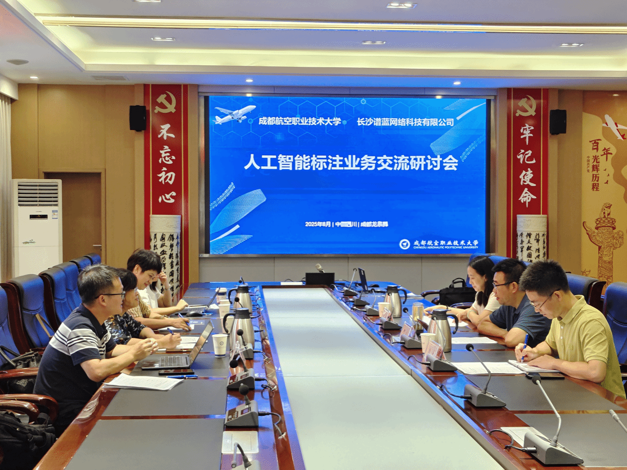 2025年8月25日上午,长沙谱蓝网络科技有限公司唐斌兵、绎达咨询(成都)股份有限公司教育业务负责人曾玲一行到访成都航空职业技术大学。原成都航空职业技术学院副院长何龙出席座谈会。双方围绕人工智能数据标注业务方面的服务需求、合作领域等事宜展开深入交流,共同探讨人工智能赋能职业教育高质量发展的实施路径。会议由学校教务处教学管理负责人康凤主持。