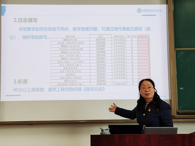 冀晓霞作教学常规工作安排。她针对学院期末考试成绩挂科率、教学日志填写、听课等情况进行强调,要求辅导员和授课老师共同做好班级学风建设,提升课堂授课质量。随后,冀晓霞就学校2024年单独招生考试安排和顶岗实习要求进行说明,同时督促各位老师做好招生、培养、就业联动,共同促进学生成长成才。