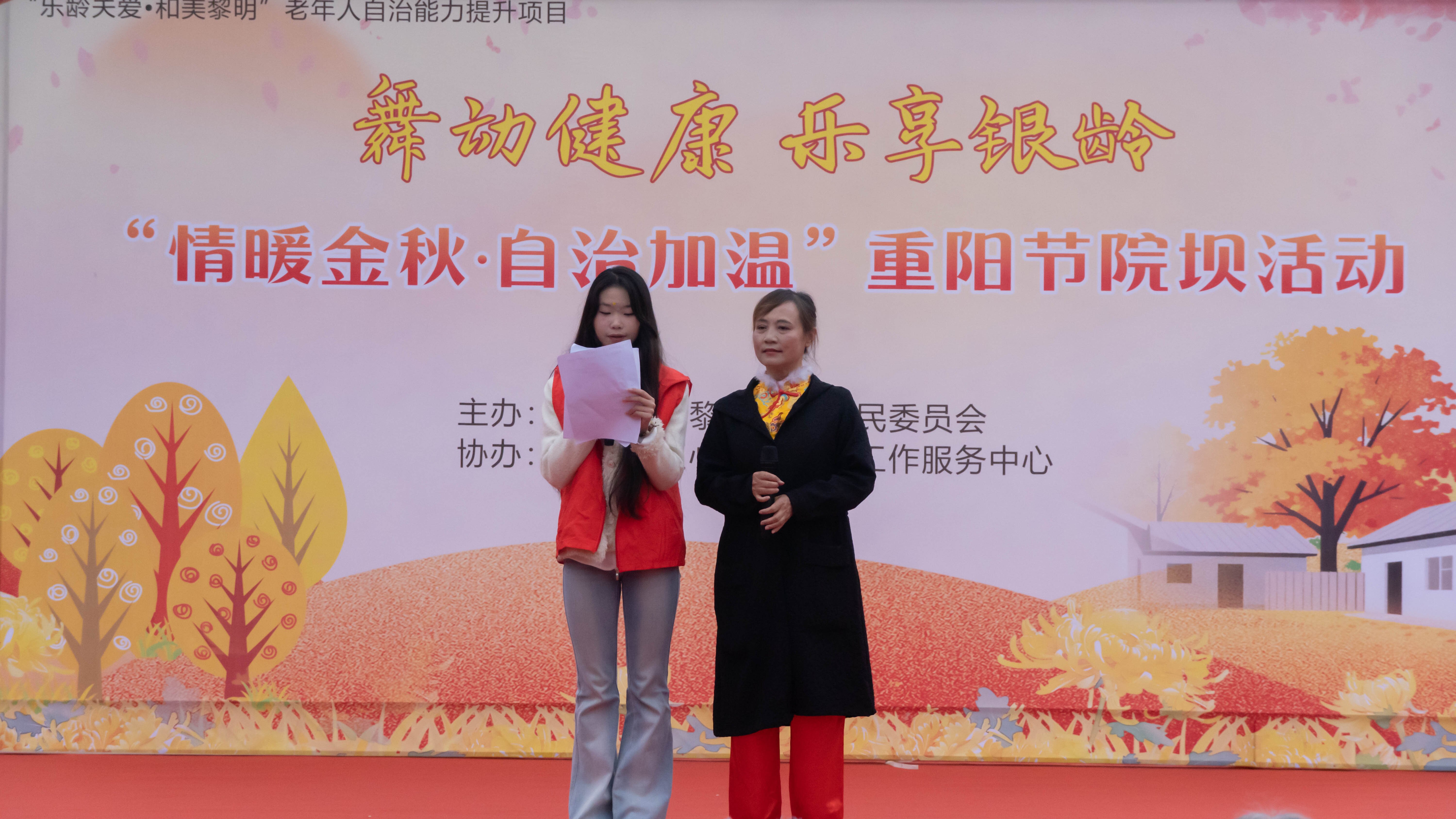 为弘扬中华民族敬老、爱老、助老的传统美德,10月28日下午,建筑工程学院团总支、学生会积极参与柏合街道黎明社区“舞动健康•乐享银龄——‘情暖金秋·自治加温’”重阳节院坝活动,与近百名社区老人共度温馨佳节,用青春力量为银龄生活添彩。