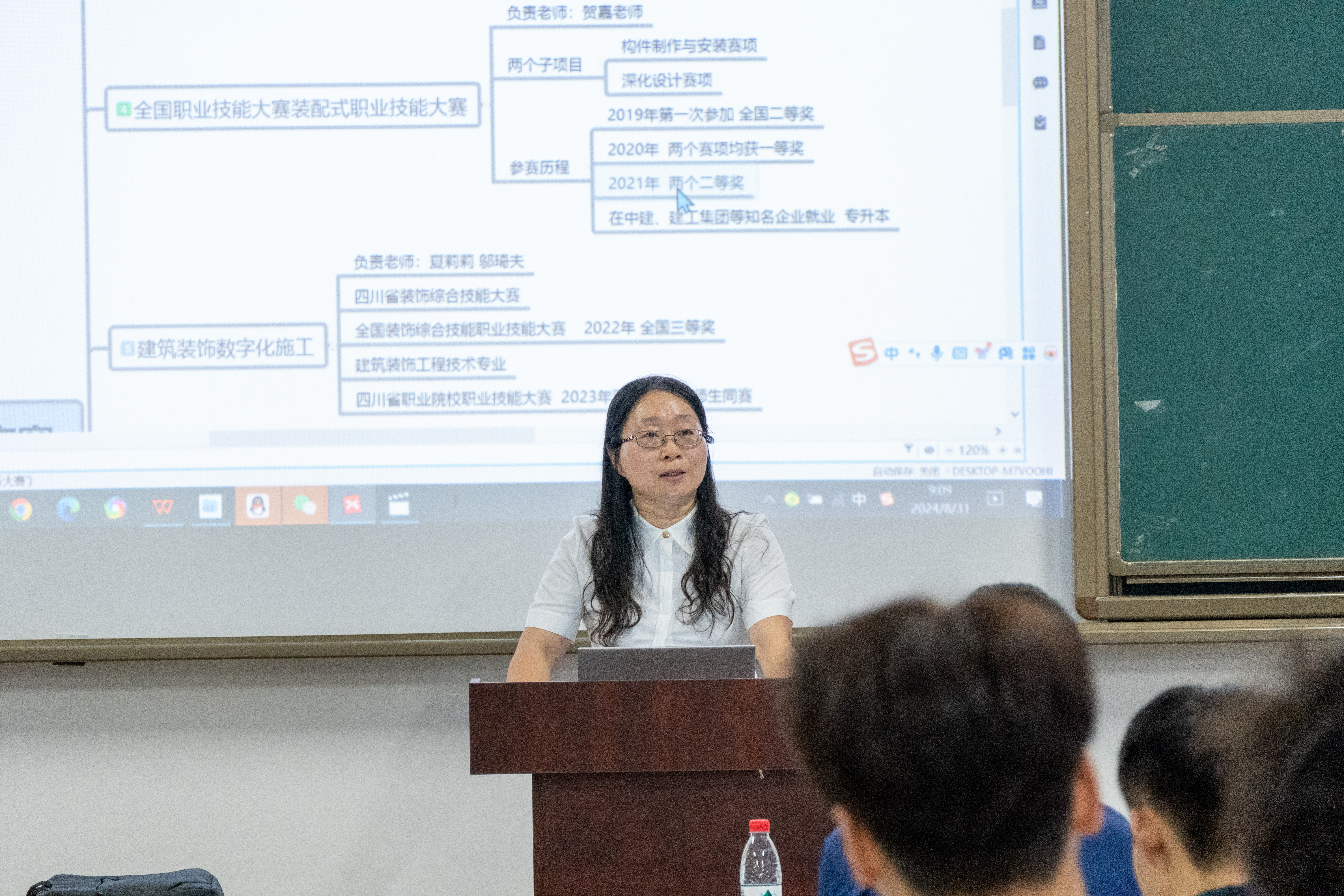 冀晓霞首先发表讲话,对同学们的到来表示衷心祝贺,同时围绕学校、学院发展历史向大家诠释了航空报国情怀、大国工匠精神。随后她介绍了建筑工程技术专业和相关师资情况,并围绕专业人才培养计划,要求大家做好学业规划和职业生涯规划。另外,冀晓霞就学院专业社团和技能竞赛相关赛项进行介绍,她指出建筑行业的发展离不开“双碳”和“AI”,希望大家在日常学习生活中,培养创新创业能力,面向国家重大战略需求、面向民生经济主战场,扎实知识基础,为国家发展贡献自己的力量。