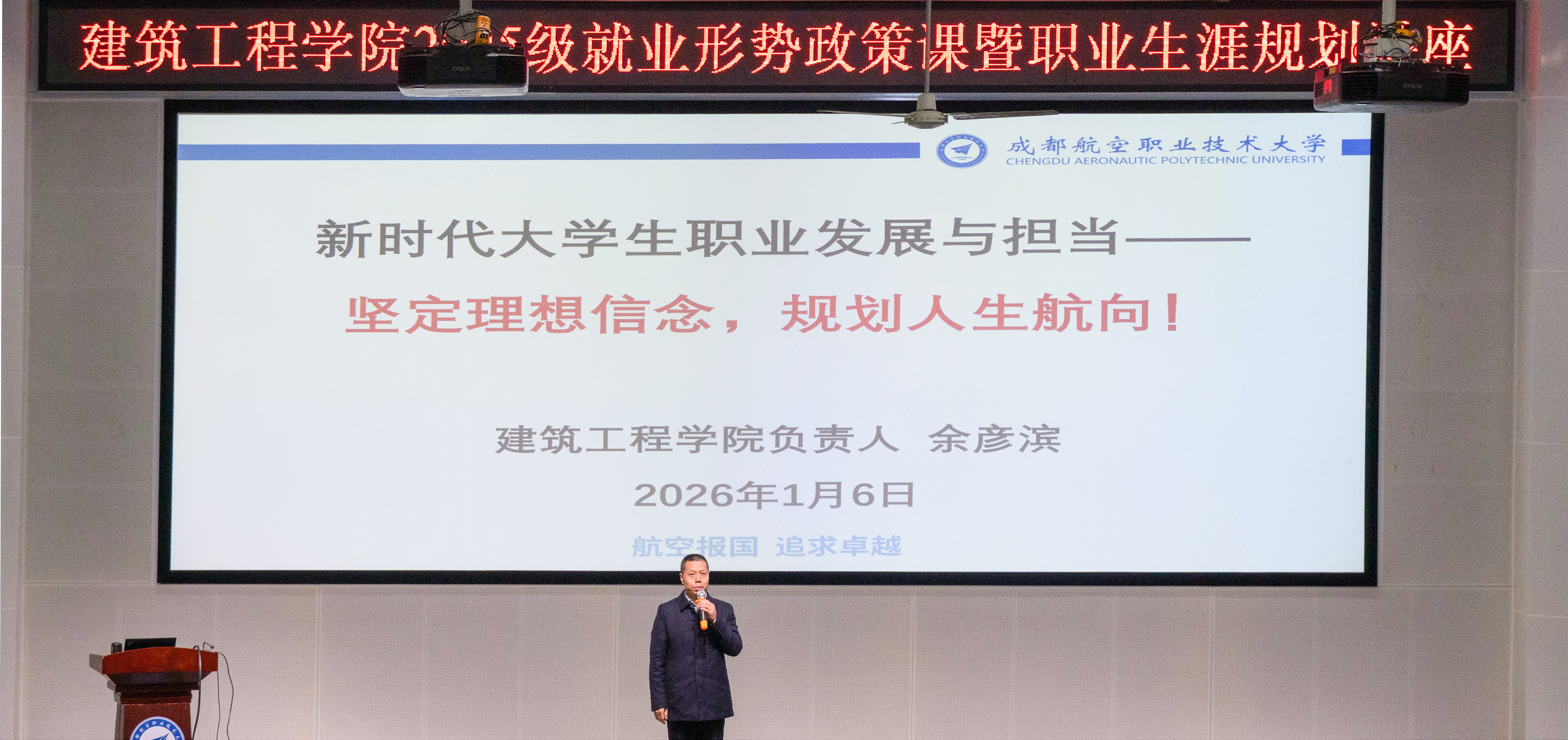 为帮助学生明确职业发展方向,提升就业竞争力,2026年1月6日下午2点建筑工程学院在博学楼报告厅举办2025级就业形势政策课暨职业生涯规划讲座。本次讲座特别邀请建筑工程学院党政负责人余彦滨老师担任主讲嘉宾,全院所有大一学生到场聆听学习。